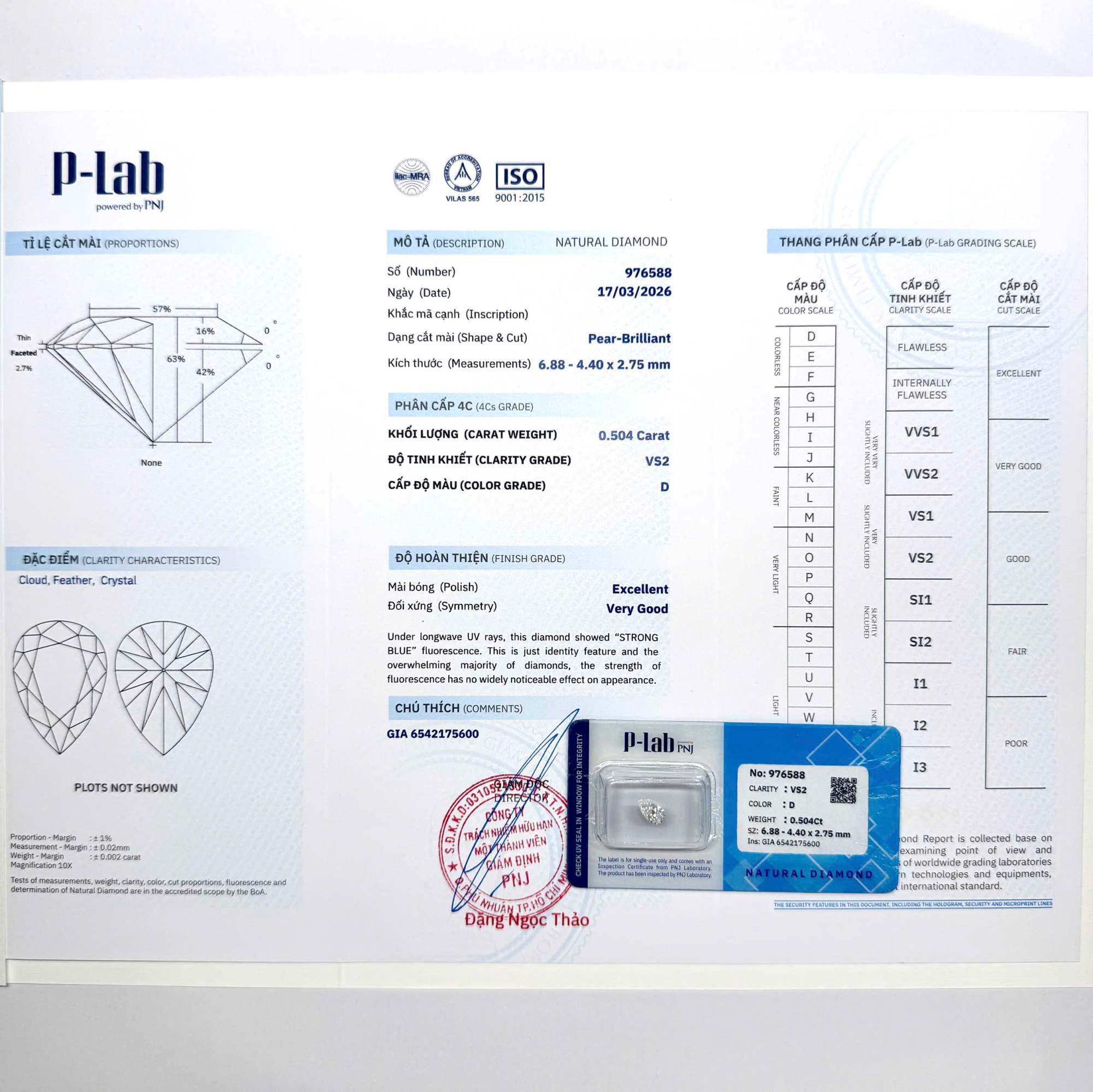 Viên kim cương PEAR 6.8–4.4LY sở hữu dáng giọt lệ thanh thoát, mang lại vẻ đẹp mềm mại và đầy cuốn hút. Sắc D đạt cấp độ trắng cao nhất, tinh khiết và rực rỡ, kết hợp độ tinh khiết VS2 cho độ trong tốt, ánh lửa sáng rõ và sống động. Kích thước cân đối giúp viên đá dễ dàng ứng dụng trong nhiều thiết kế, đặc biệt phù hợp với phong cách trang sức tinh tế và sang trọng.