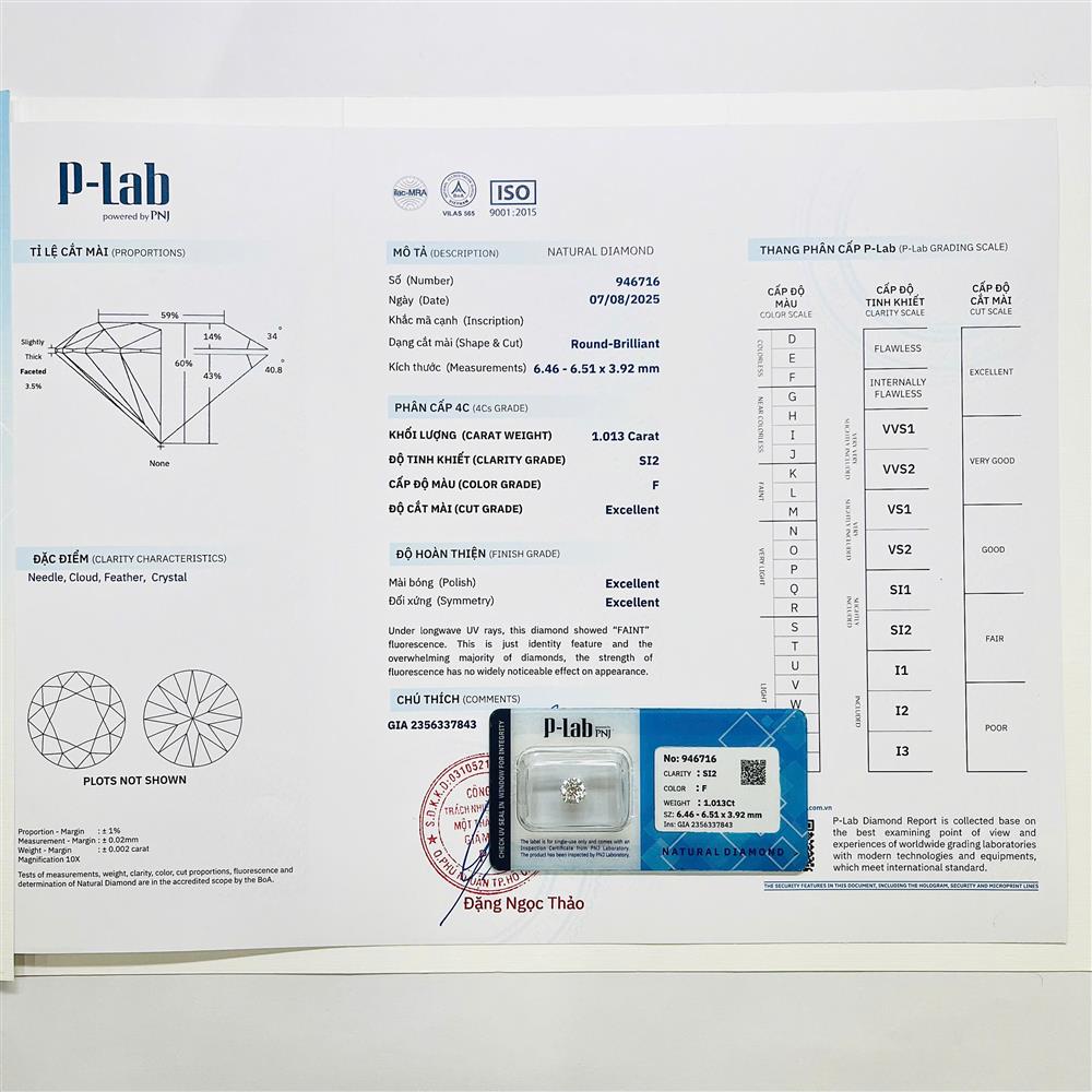 Viên kim cương 6.4–6.5LY F/SI2 mang sắc trắng thanh nhã và độ sáng nổi bật, phù hợp chế tác nhẫn solitaire, bông tai hoặc mặt dây chuyền tinh giản. Khi kết hợp họa tiết đơn giản, thiết kế thanh thoát sẽ làm nổi bật ánh sáng rực rỡ, tôn lên vẻ đẹp sang trọng và cuốn hút tự nhiên của viên chủ.