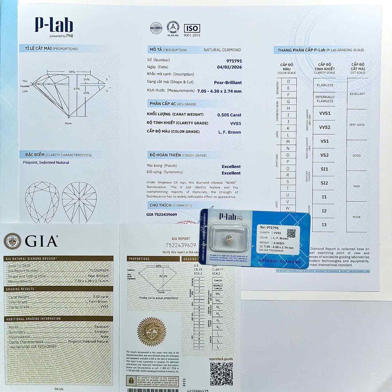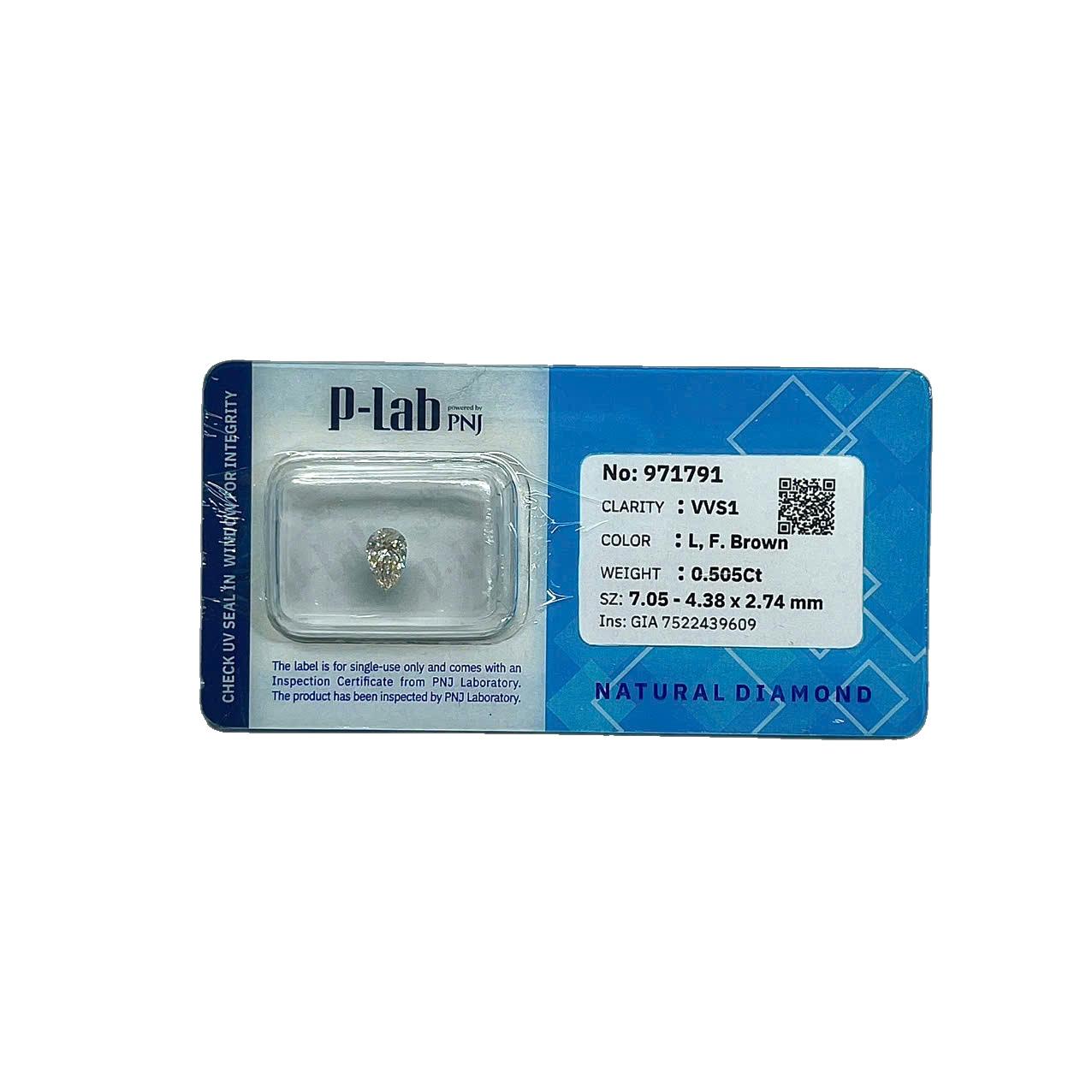 Viên kim cương PEAR 7.0–4.3LY L, Fancy Brown/VVS1 mang sắc nâu ấm tinh tế, tạo chiều sâu ánh sáng và cảm giác sang trọng. Độ tinh khiết cao giúp viên đá trong và phản chiếu ổn định. Dáng giọt nước mềm mại với tỷ lệ cân đối rất phù hợp để chế tác nhẫn trung tâm hoặc mặt dây chuyền nổi bật.