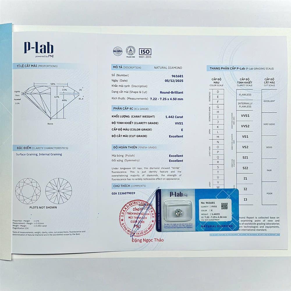 Viên kim cương 7.2LY E/VVS1 sở hữu ánh sáng trong trẻo đầy uyển chuyển, vừa tinh khiết vừa có chiều sâu. Sắc trắng E tạo cảm giác thanh cao, còn độ tinh khiết VVS1 cho ánh lửa bật lên sạch và sắc như một dải sáng mảnh. Khi đưa vào thiết kế tinh giản, viên chủ toát lên khí chất sang trọng, sáng rõ và rất “đẳng cấp” khi nhìn trực diện.