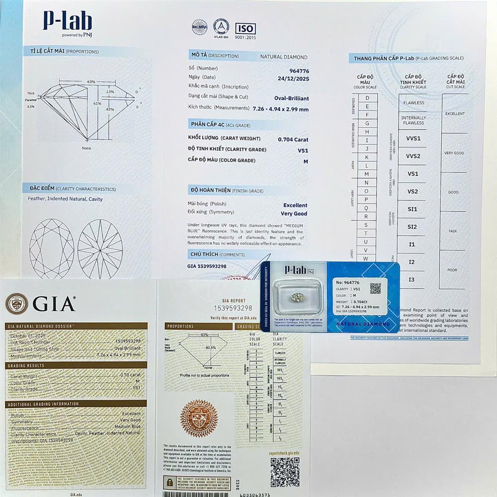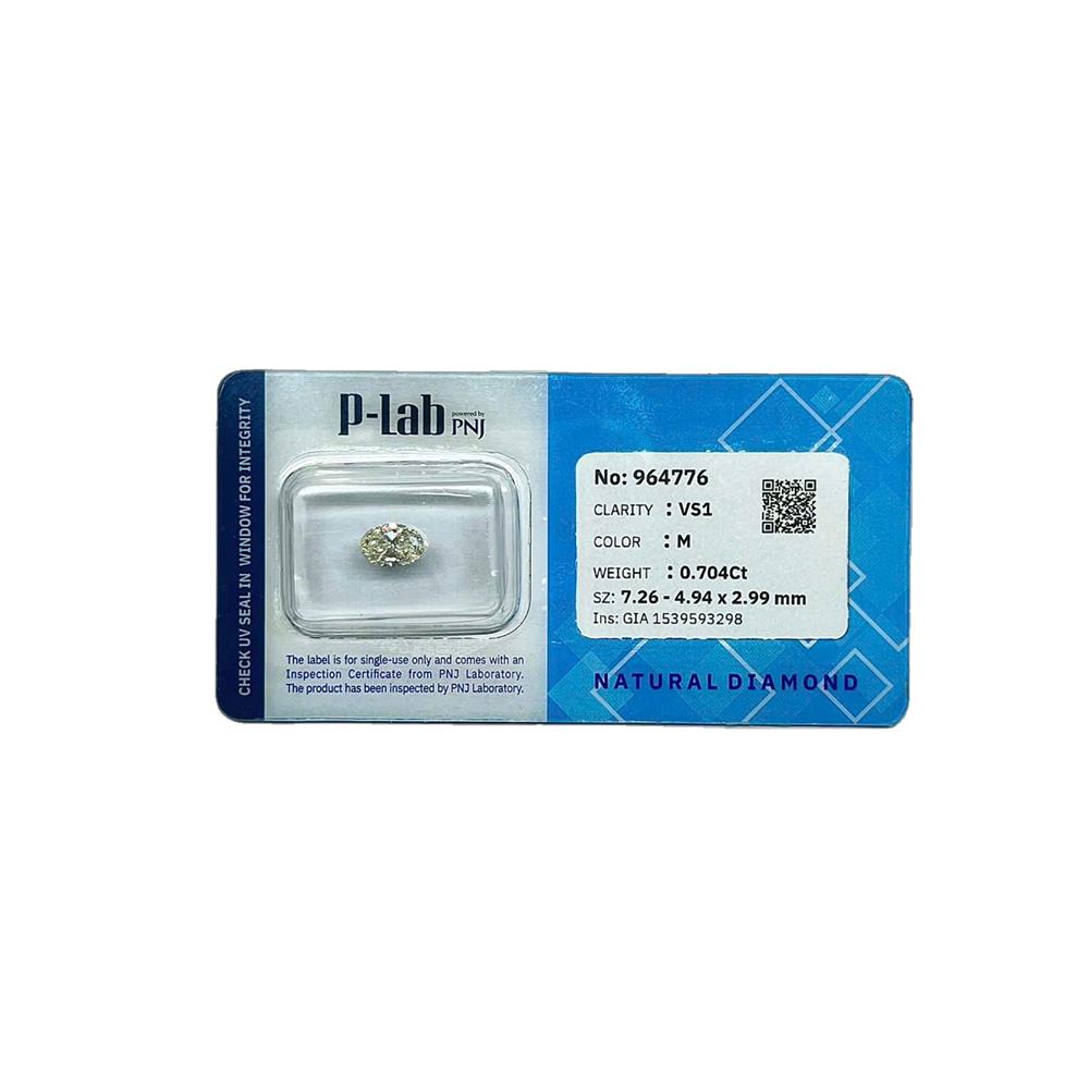 Viên kim cương Oval 7.2–4.9LY màu M, độ tinh khiết VS1 sở hữu sắc ánh ấm tự nhiên, tạo chiều sâu và cảm giác sang trọng cổ điển. Dáng oval giúp viên đá trông lớn và thon gọn hơn, khả năng phản xạ ánh sáng tốt, độ sạch cao, rất phù hợp cho thiết kế trang sức tinh tế, thanh lịch và dễ đeo hằng ngày.
