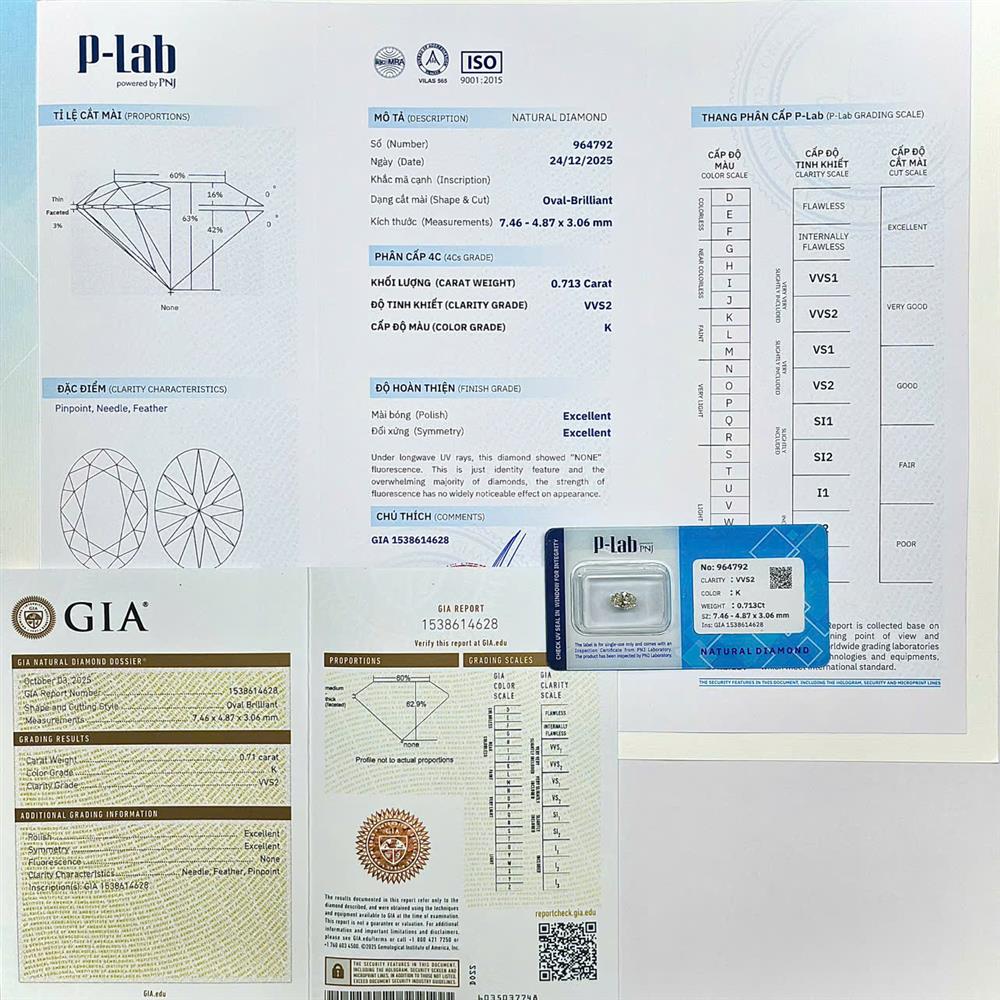 Viên kim cương Oval 7.4–4.8LY K/VVS2 sở hữu sắc K ấm nhẹ, mang nét sang trọng tinh tế và rất dễ ứng dụng trong trang sức cao cấp. Độ tinh khiết VVS2 cho bề mặt cực sạch, ánh sáng phản chiếu đều, tạo độ lấp lánh rõ ràng. Dáng Oval thon dài giúp viên đá trông lớn và thanh thoát hơn, tôn tay hiệu quả, đặc biệt đẹp khi gắn nhẫn hoặc mặt dây phong cách thanh lịch – hiện đại nhưng vẫn giữ được chiều sâu và cá tính riêng.