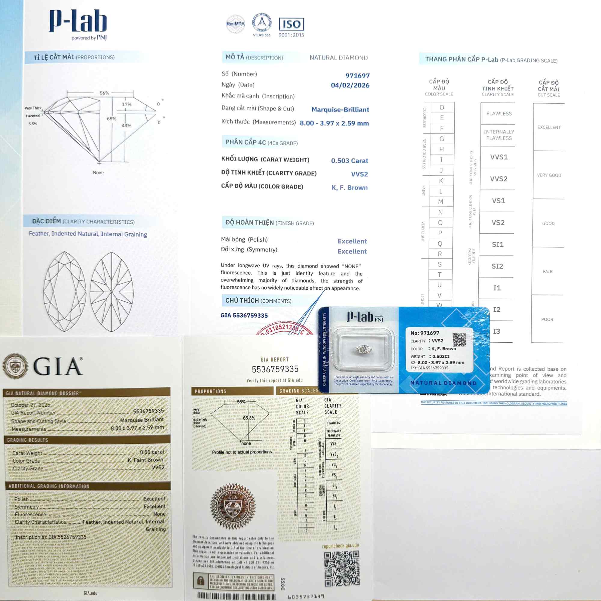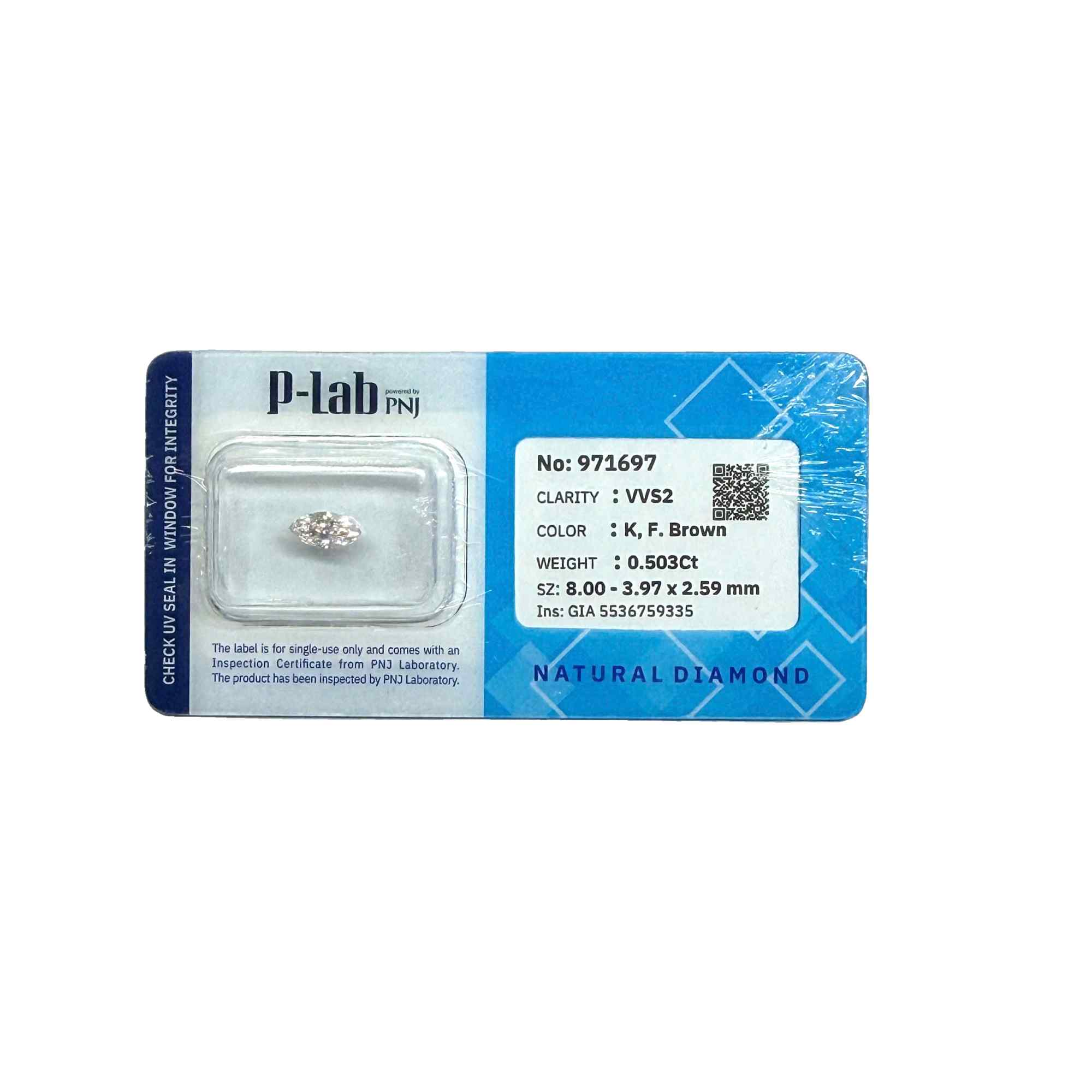 Viên kim cương MARQUISE 8.0–3.9LY K, Fancy Brown/VVS2 mang sắc nâu ấm đặc trưng, tạo vẻ đẹp trầm và cá tính. Độ tinh khiết rất cao giúp bề mặt viên đá trong và phản chiếu tốt. Dáng marquise thon dài làm nổi bật đường nét thanh thoát. Phù hợp chế tác nhẫn solitaire hoặc mặt dây chuyền với thiết kế tối giản.