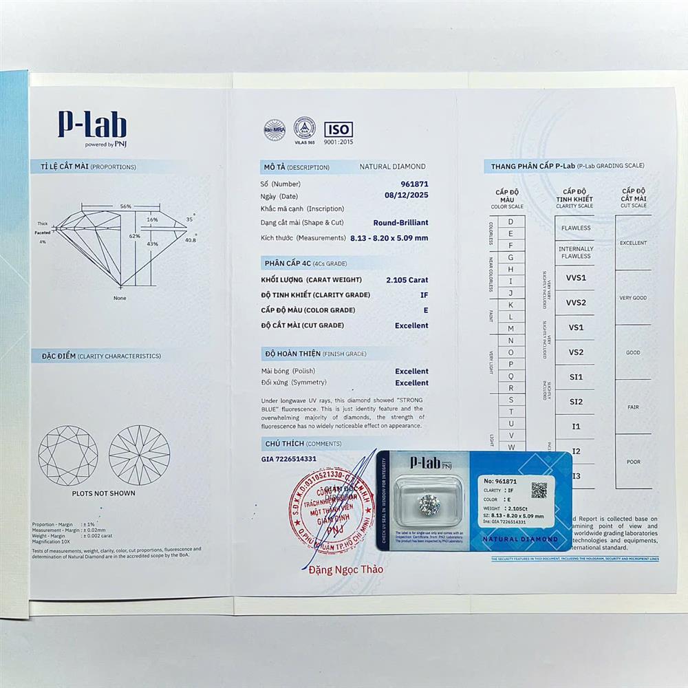Viên kim cương 8.1 8.2LY E/IF toát lên vẻ đẹp gần như tuyệt đối, ánh sáng bừng lên trong trẻo và sắc nét đến mức tạo cảm giác “không tì vết” ngay từ khoảnh khắc nhìn vào. Sắc trắng E thanh cao kết hợp độ tinh khiết IF khiến từng tia lửa hiện lên chuẩn xác, sang trọng và đầy uy lực. Khi đặt vào thiết kế tinh giản, viên chủ trở thành tâm điểm rực sáng với khí chất đẳng cấp khó hòa lẫn.