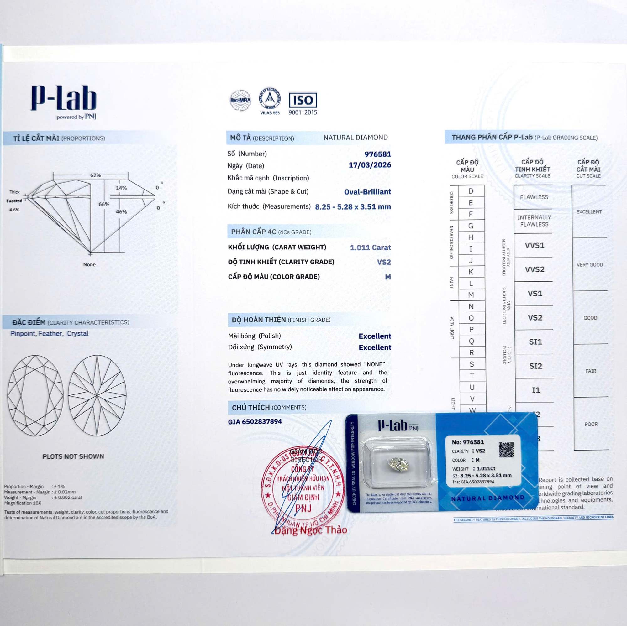 Viên kim cương OVAL 8.2–5.2LY sở hữu form dáng thon dài thanh lịch, giúp tạo hiệu ứng ngón tay dài và mềm mại khi chế tác trang sức. Sắc M mang tông ấm nhẹ độc đáo, kết hợp độ tinh khiết VS2 cho độ trong tốt, vẫn đảm bảo độ lấp lánh rõ ràng. Kích thước lớn nổi bật cùng kiểu cắt oval giúp viên đá tỏa sáng tinh tế, phù hợp với những thiết kế mang phong cách cá tính và sang trọng.