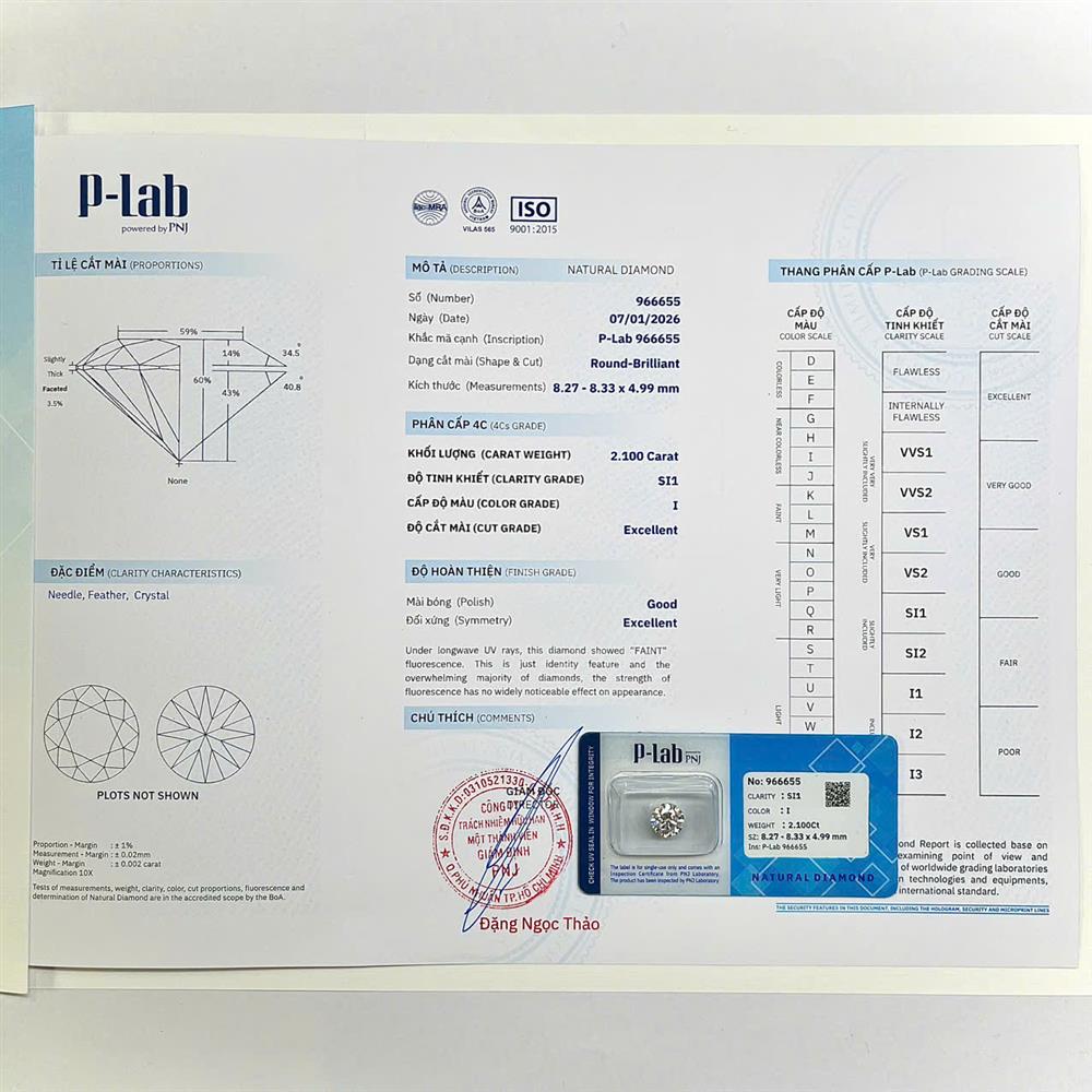 Viên kim cương 8.2-8.3LY tạo dấu ấn nổi bật nhờ diện mạo lớn, hiếm và giá trị cao. Sắc I trắng ngà hài hòa giúp viên đá giữ được độ sáng tự nhiên, kết hợp độ tinh khiết SI1 với bao thể nhỏ, khó nhận thấy khi đeo, vẫn đảm bảo hiệu ứng lấp lánh mạnh mẽ. Lựa chọn lý tưởng cho trang sức chủ đạo, khẳng định đẳng cấp và gu thẩm mỹ tinh tế.