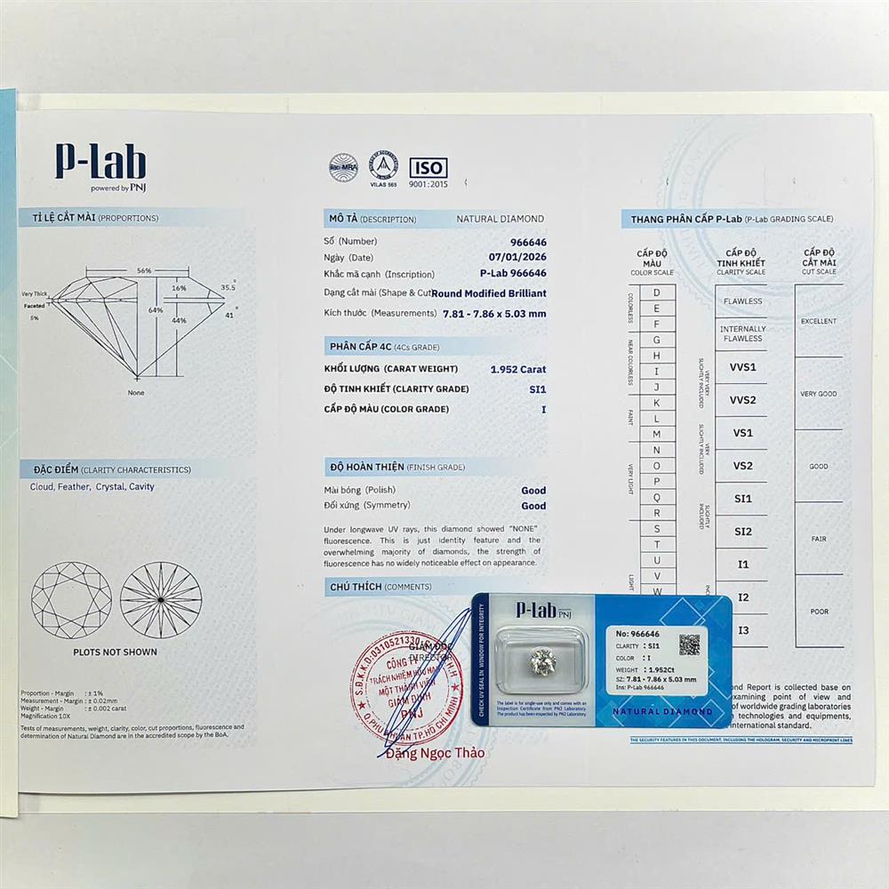 Viên kim cương 7.8LY gây ấn tượng mạnh với diện mạo lớn, nổi bật và đầy giá trị. Sắc I trắng ngà giữ được độ sáng hài hòa, dễ phối trong nhiều thiết kế trang sức cao cấp. Độ tinh khiết SI1 với bao thể nhỏ, khó nhận thấy khi sử dụng, vẫn đảm bảo độ lấp lánh và hiệu ứng ánh sáng cuốn hút.