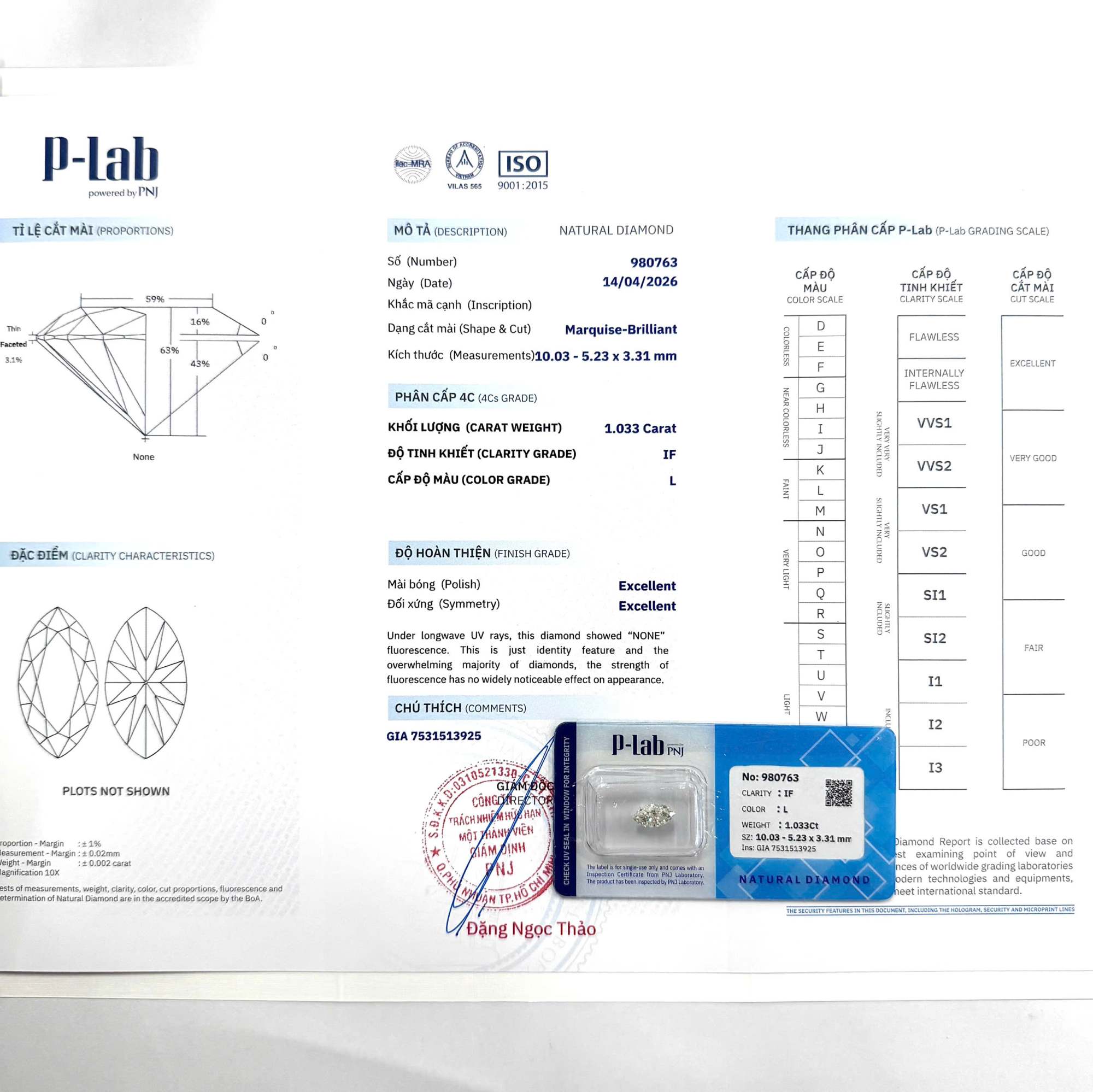 Viên kim cương MARQUISE 10.0–5.2LY L/IF nổi bật với kích thước lớn và độ tinh khiết hoàn hảo, mang đến ánh sáng trong suốt, sắc nét. Sắc ấm nhẹ tạo nét cổ điển, sang trọng riêng biệt. Phù hợp chế tác nhẫn statement, mặt dây chuyền cao cấp hoặc trang sức cá tính, ưu tiên thiết kế tối giản để tôn vinh vẻ đẹp độc đáo của viên chủ.