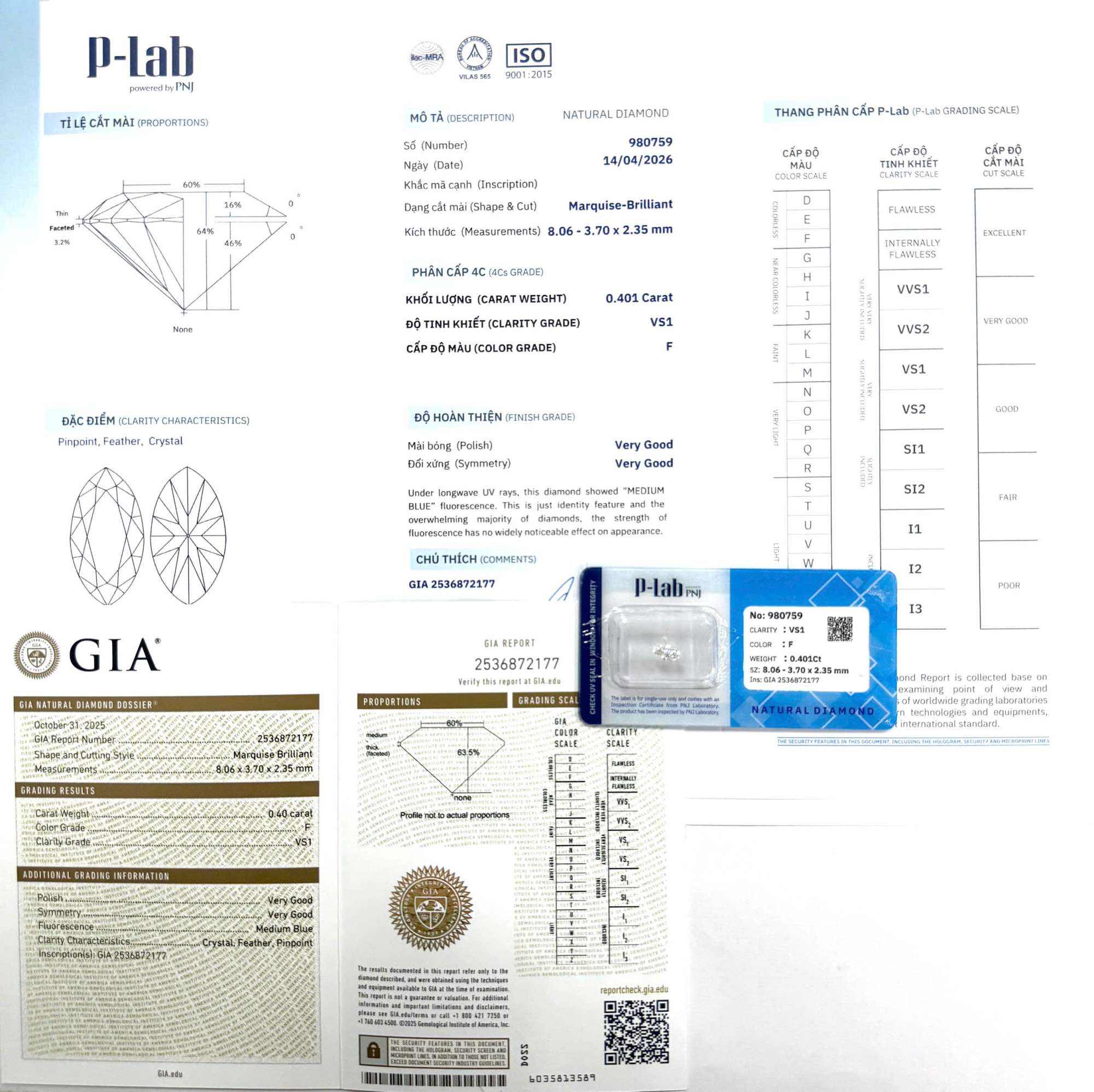 Kim cương viên Marquise 8.06 – 3.70 F VS1 P-LAB, GIA DDD0028657