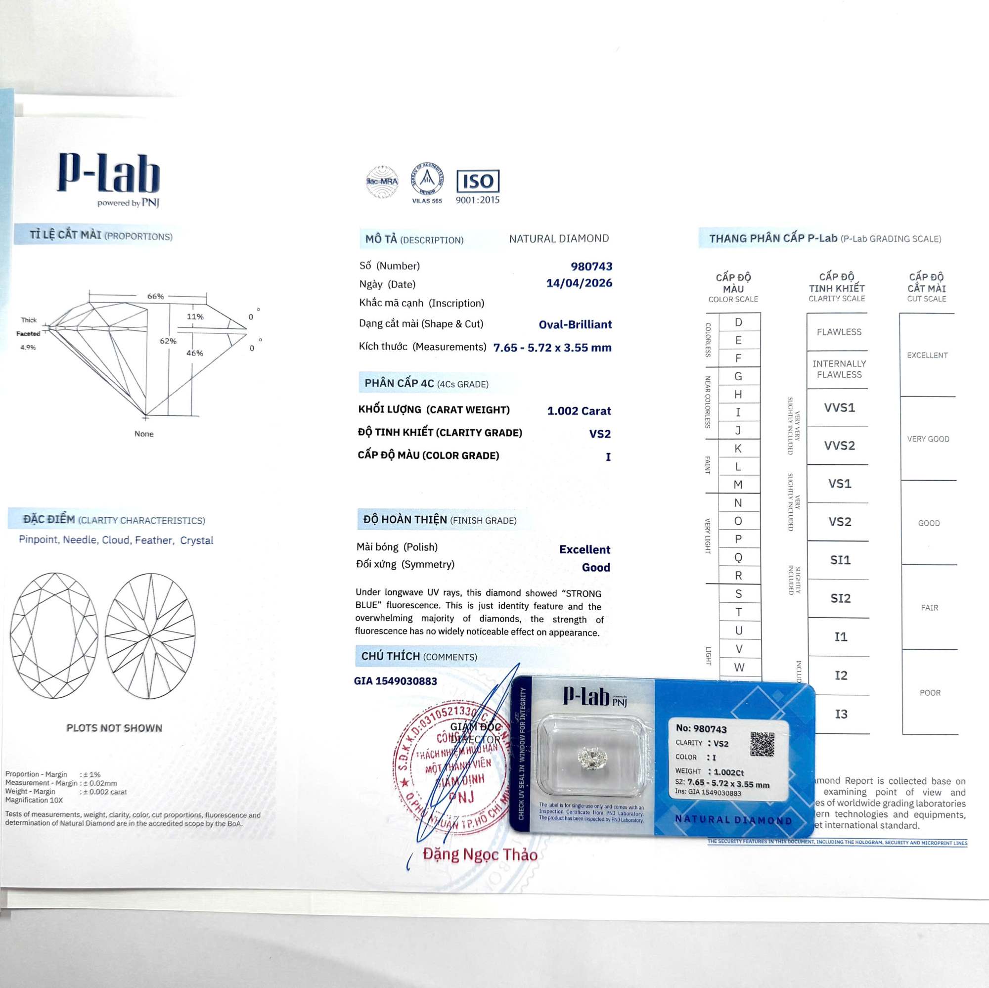 Viên kim cương OVAL 7.6–5.7LY I/VS2 sở hữu tỷ lệ thuôn dài cân đối, tạo hiệu ứng mở rộng diện tích và tôn dáng tay thanh thoát. Sắc trắng ấm nhẹ mang nét mềm mại, kết hợp độ tinh khiết khá giúp ánh sáng lan tỏa tự nhiên. Phù hợp chế tác nhẫn đính hôn, mặt dây chuyền hoặc hoa tai, ưu tiên thiết kế tinh giản để làm nổi bật viên chủ.