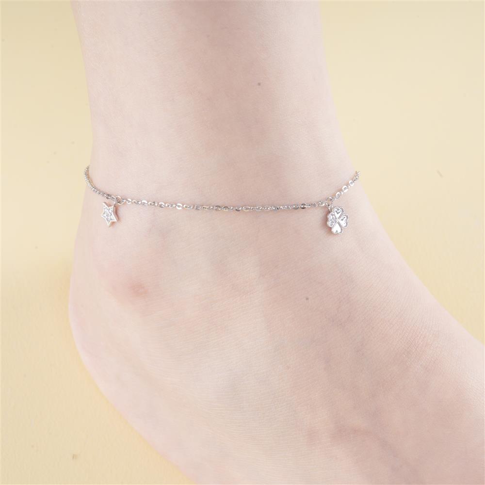 Chiếc lắc chân đính charm mang đến vẻ đẹp tinh tế và duyên dáng, là sự kết hợp hài hòa giữa thiết kế thanh mảnh và những biểu tượng may mắn: mặt trăng, ngôi sao, cỏ 4 lá và trái tim nhỏ xinh tạo nên sự chuyển động uyển chuyển, lấp lánh theo từng bước đi
