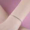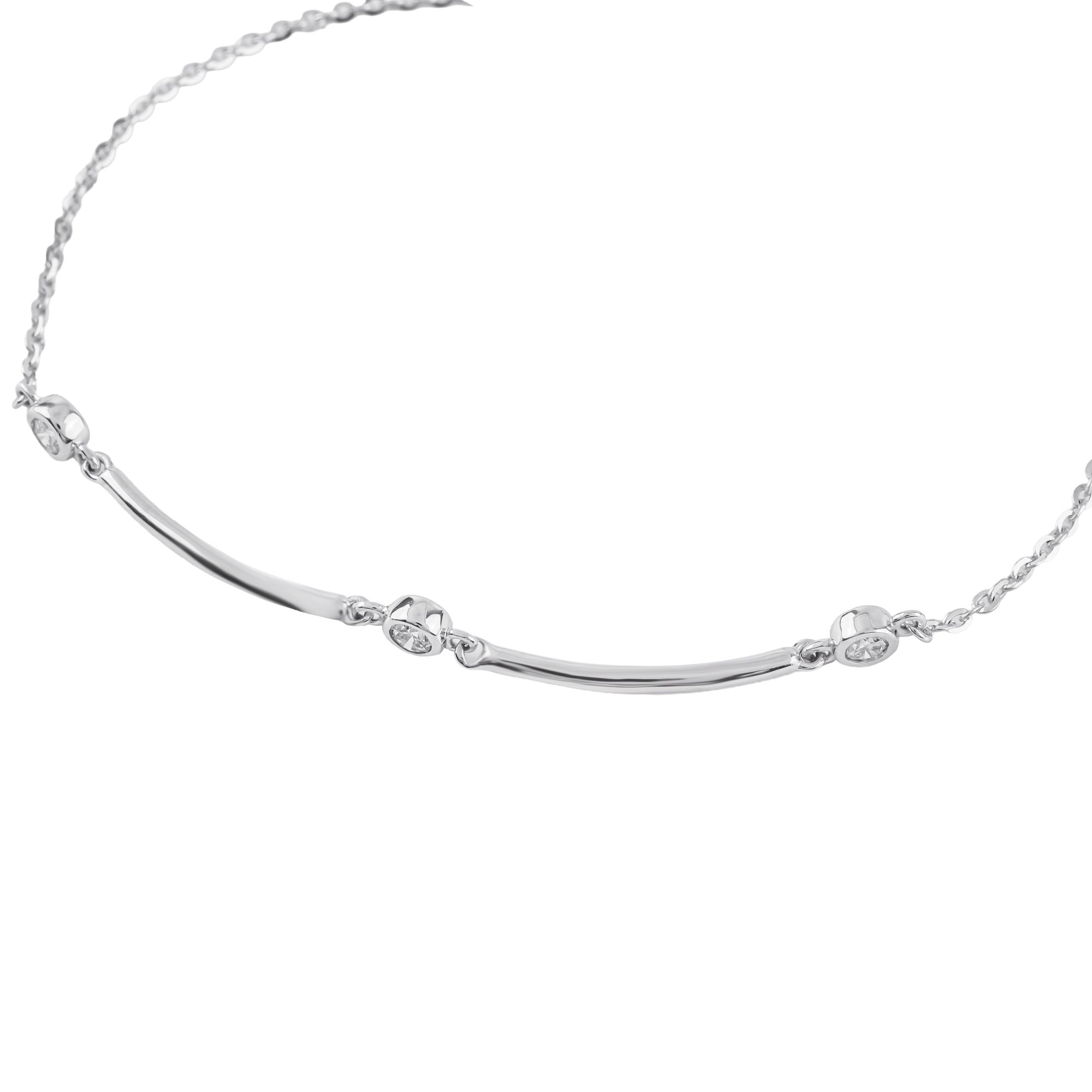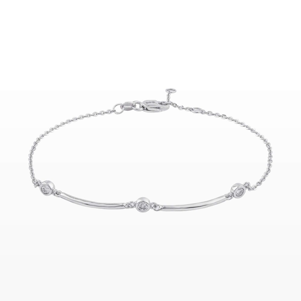 Thiết kế mảnh nhẹ với những đường cong mềm mại, như dòng chảy êm đềm ôm lấy cổ tay. Ba viên kim cương nhỏ được đặt tinh tế dọc theo trung tâm, lấp lánh vừa đủ, tựa những điểm sáng bình yên giữa nhịp sống bận rộn. Ánh kim cương phản chiếu nhẹ nhàng trên nền kim loại sáng mịn, tạo nên vẻ đẹp thanh lịch, tinh khiết và rất đỗi nữ tính.