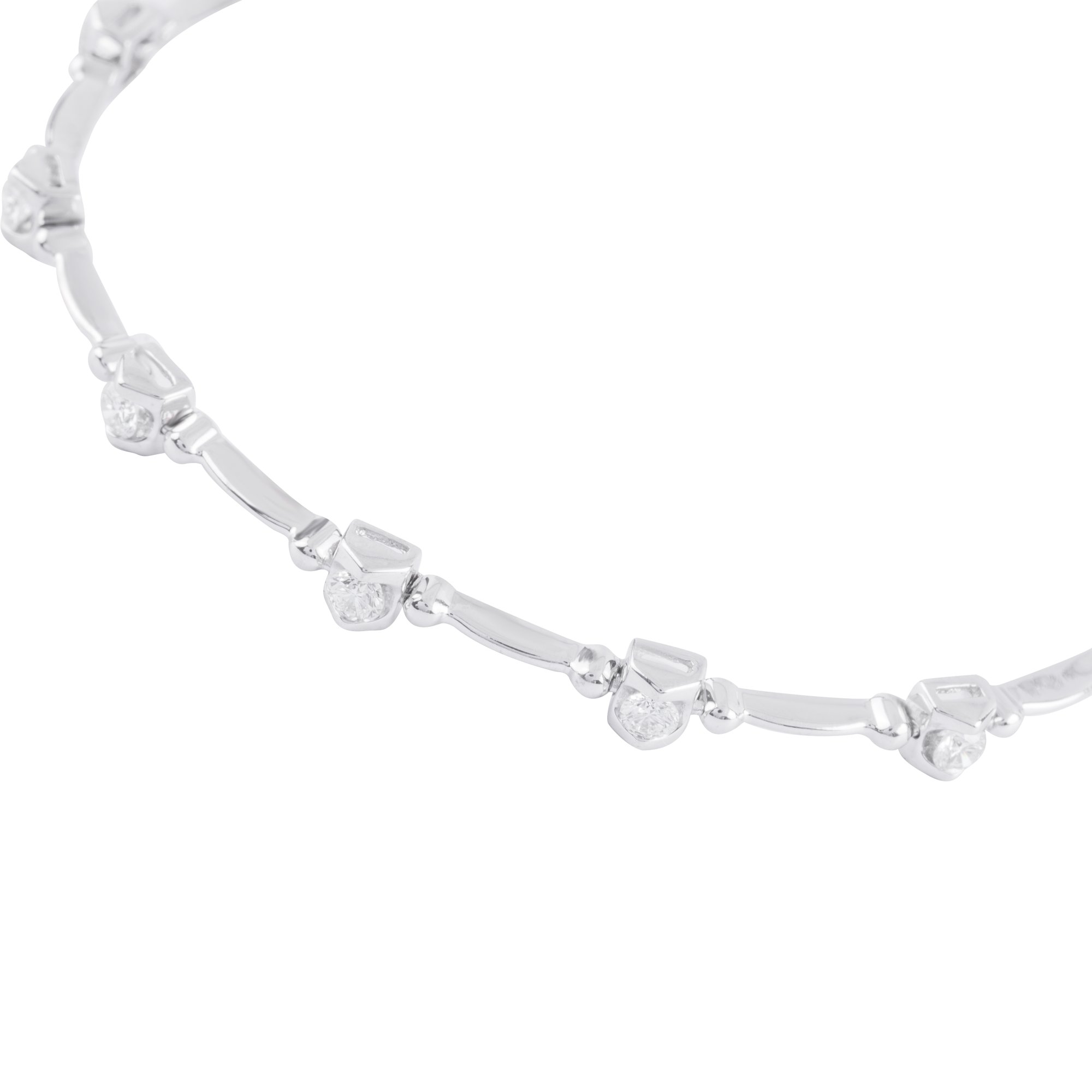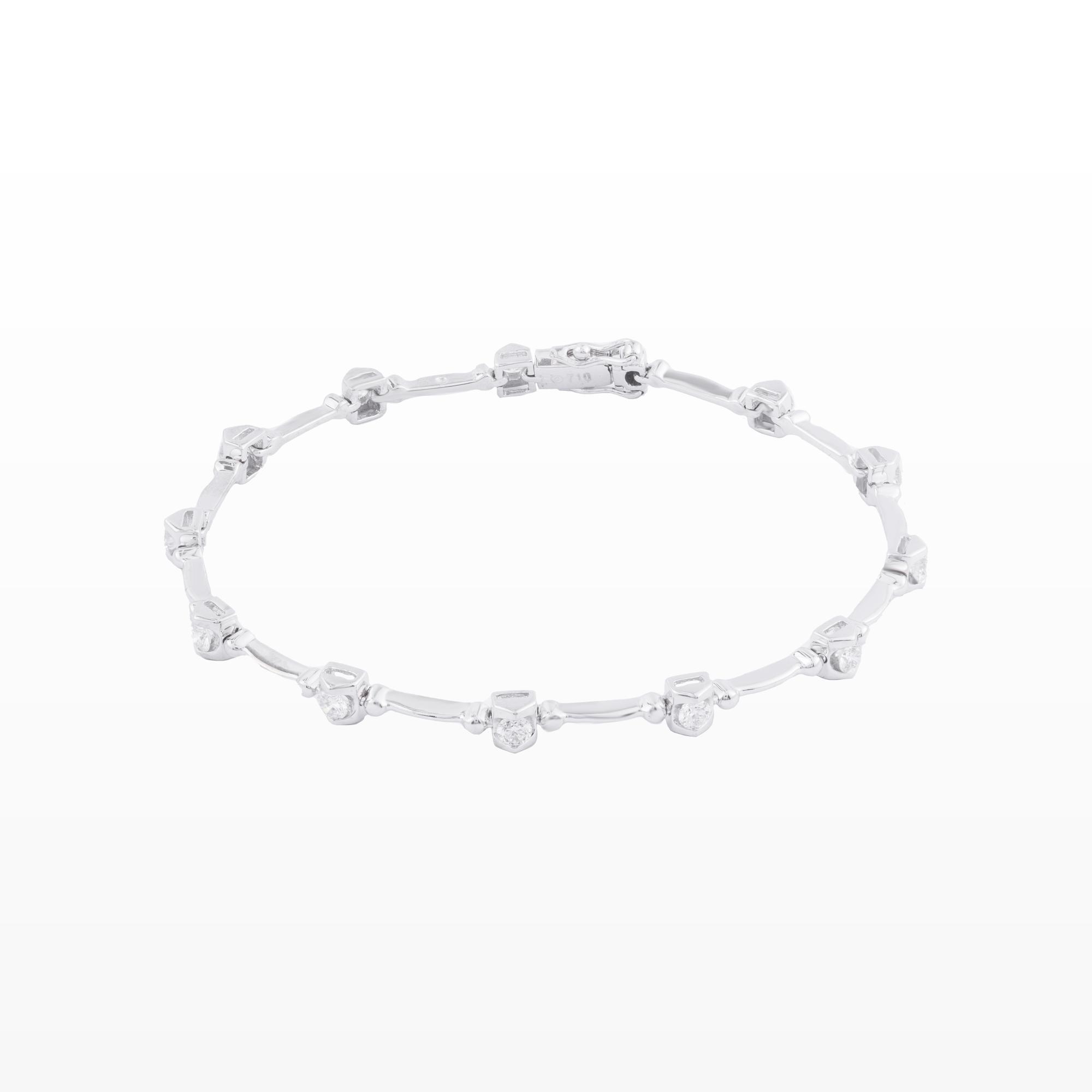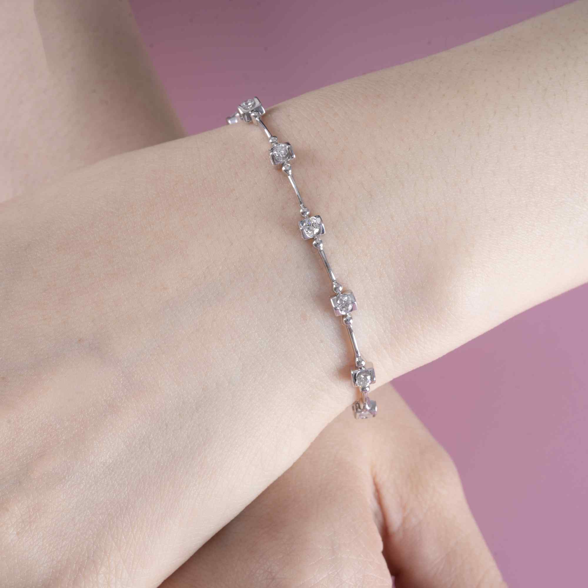 Tựa như những đốm sáng nhỏ lấp lánh quanh cổ tay, chiếc lắc tay mang đến vẻ đẹp dịu dàng nhưng đầy cuốn hút. Các viên kim cương được đính cách điệu theo từng điểm nhấn tinh tế, nối kết bằng những thanh mảnh mềm mại tạo nên tổng thể thanh thoát và nữ tính.