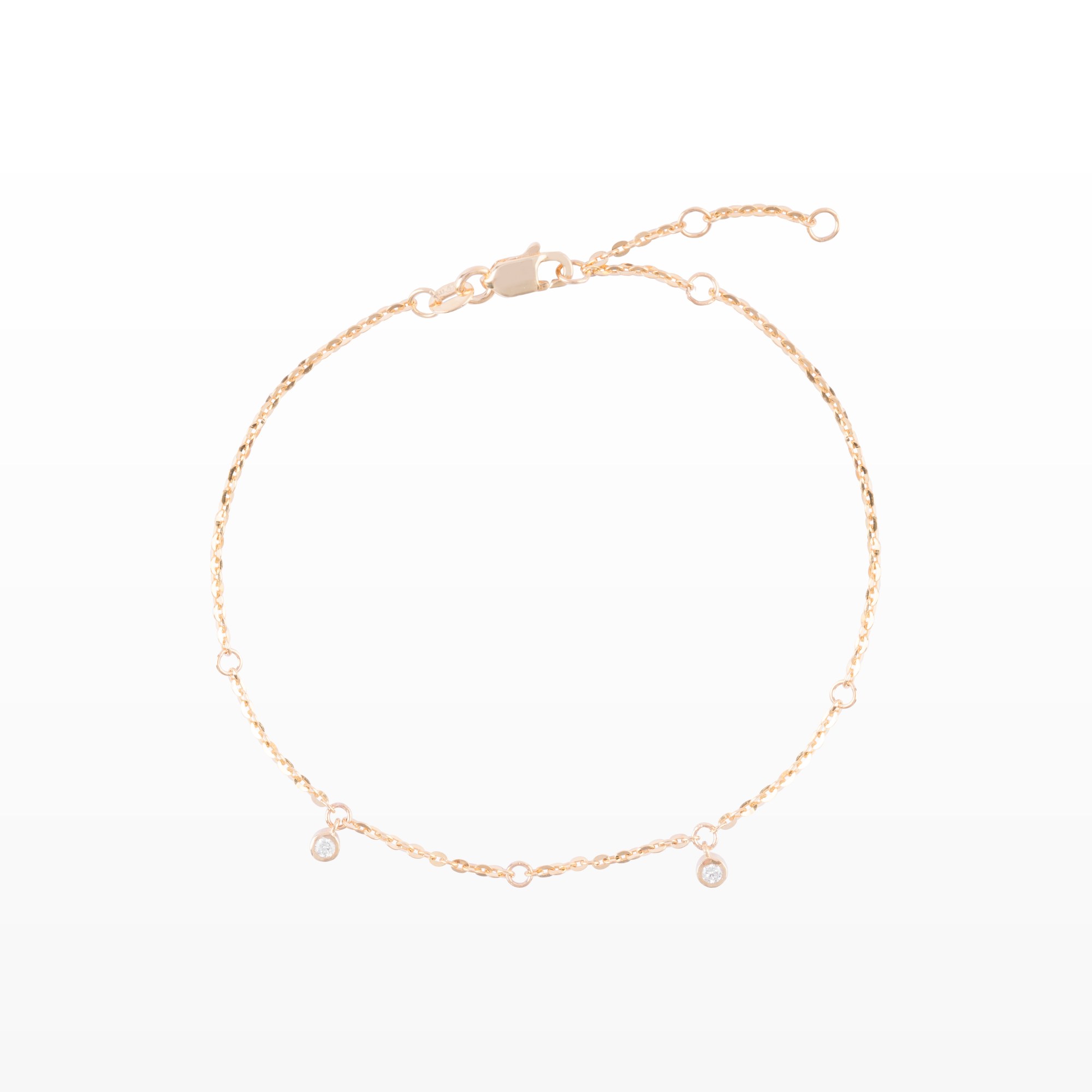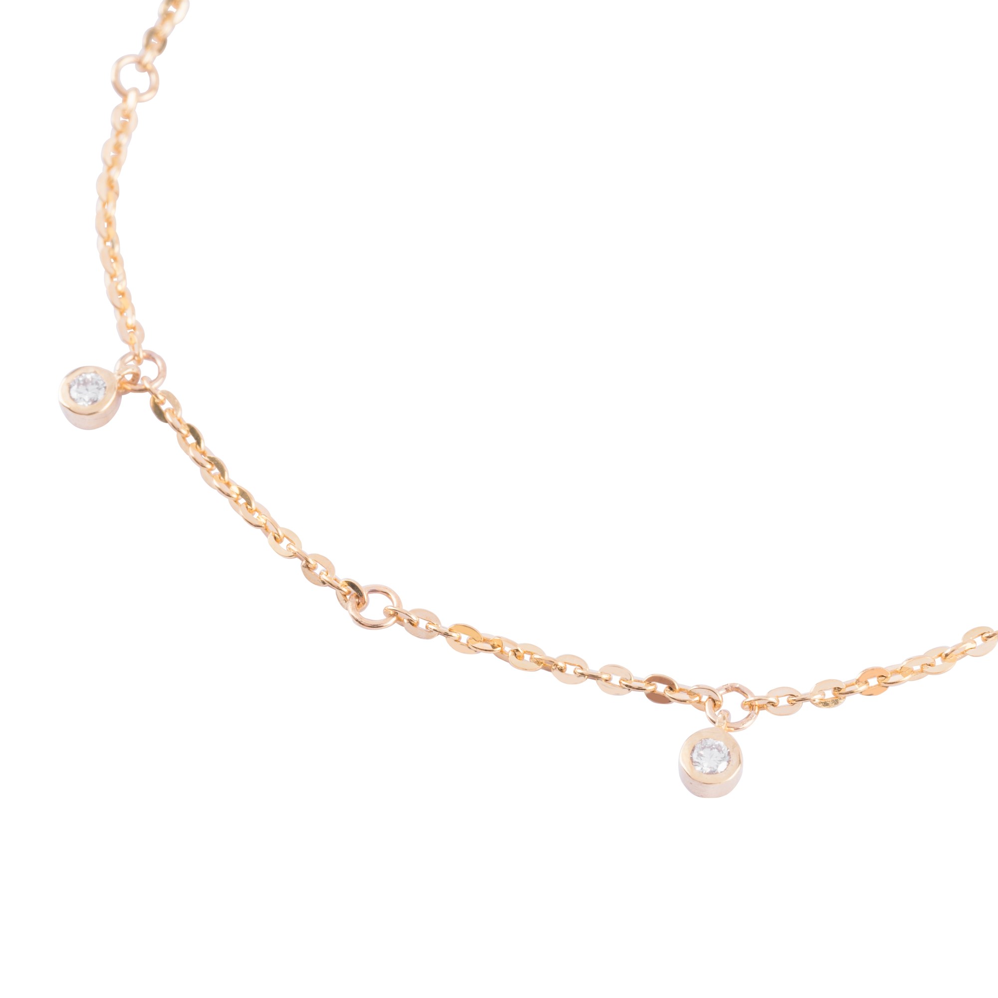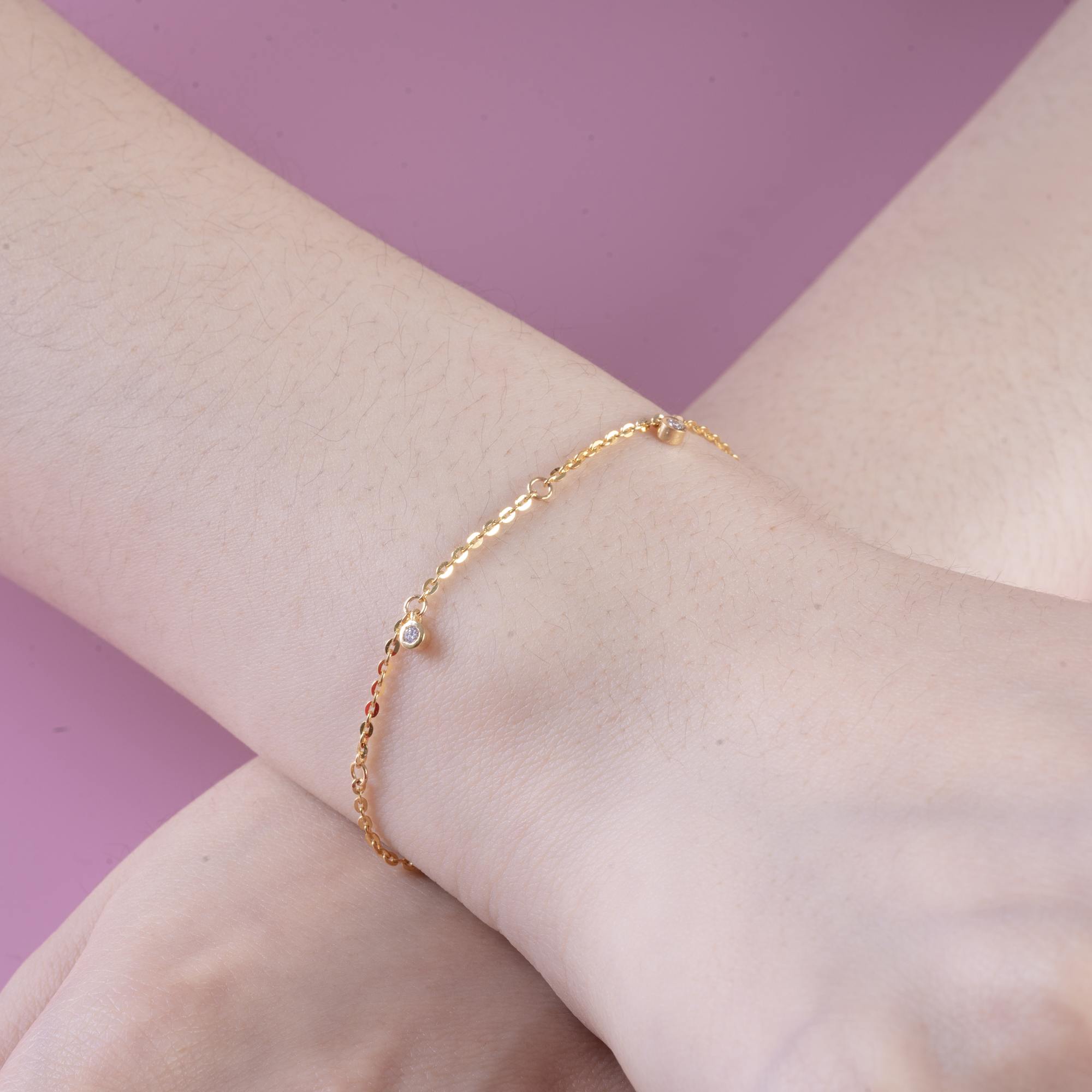 Chiếc lắc tay mang vẻ đẹp tối giản thanh thoát, nổi bật với sợi dây vàng mảnh nhẹ ôm trọn cổ tay một cách tinh tế. Điểm xuyết trên dây là những viên kim cương nhỏ được đính rải rác, tạo hiệu ứng lấp lánh nhẹ nhàng như những tia sáng tinh khôi chuyển động theo từng cử chỉ.
