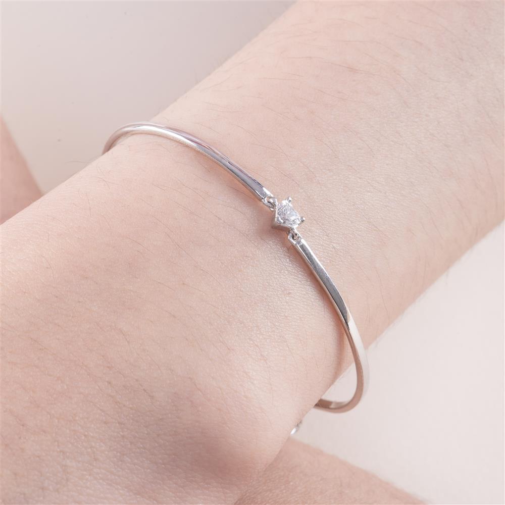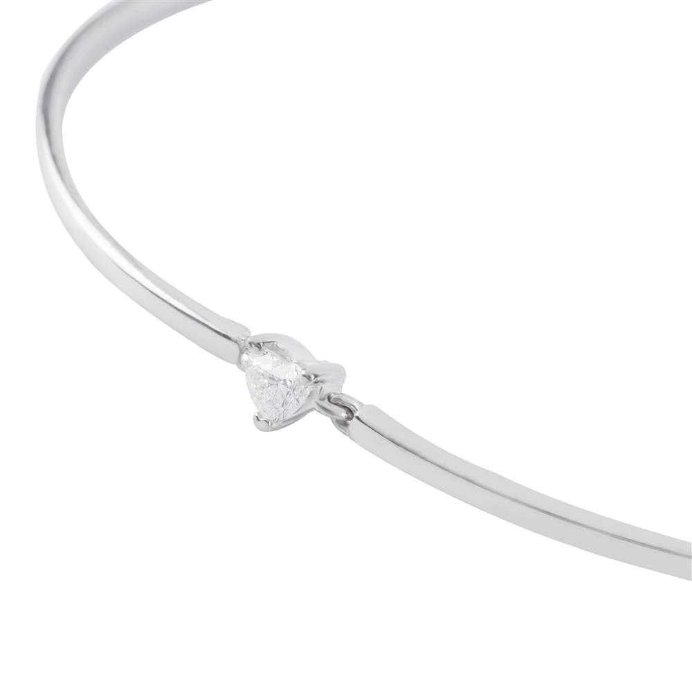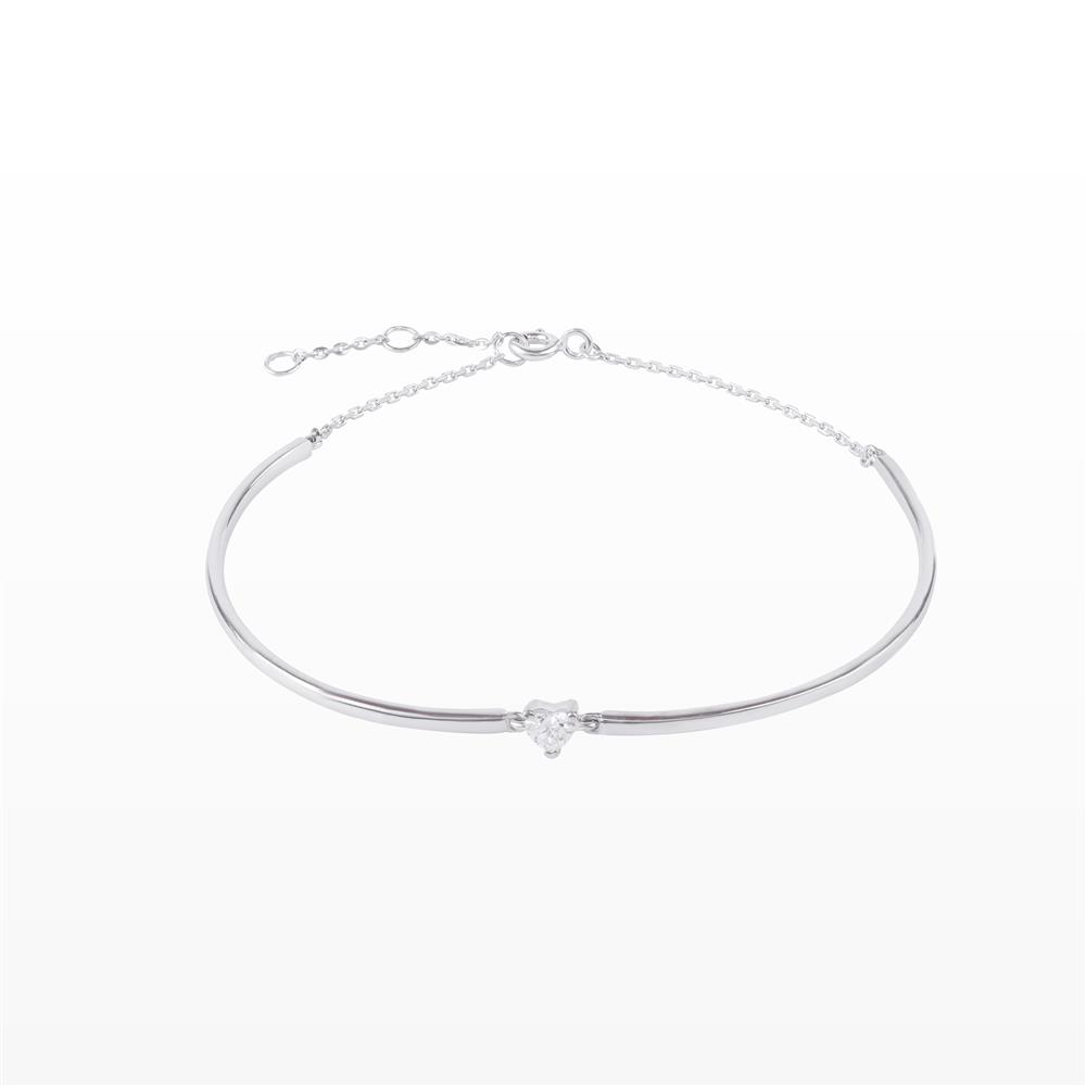 Chiếc vòng tay được chế tác theo phong cách tối giản hiện đại, với phần thân vòng mảnh mai ôm lấy cổ tay đầy uyển chuyển. Điểm nhấn ở trung tâm là viên kim cương cắt trái tim – biểu tượng của sự yêu thương và vẻ đẹp thuần khiết.