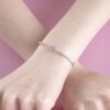 Lắc tay thiết kế thanh mảnh, nổi bật với viên đá chủ dáng tròn đặt tại trung tâm, tỏa sáng rực rỡ như điểm hội tụ của mọi ánh nhìn. Dải kim cương tấm được đính dọc theo thân lắc, tạo hiệu ứng lấp lánh liên tục, mang lại vẻ đẹp tinh tế và cuốn hút trong từng chuyển động.
