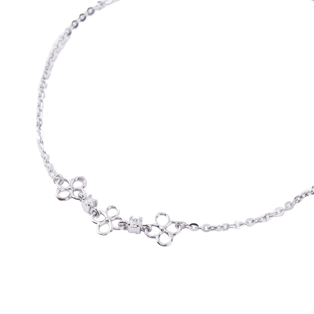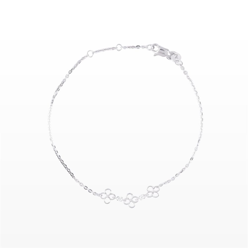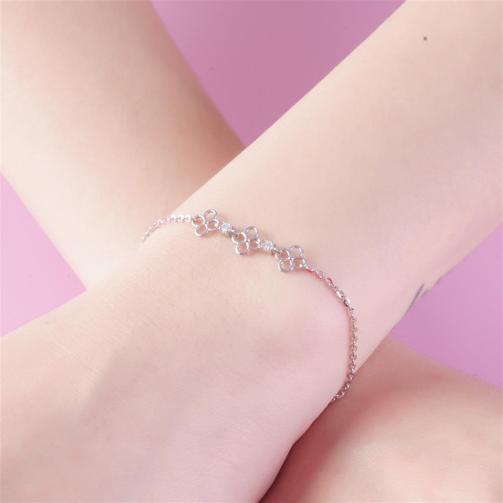 Lắc tay sở hữu thiết kế chuỗi mảnh thanh thoát, điểm xuyết các họa tiết hoa 4 cánh cách điệu đan xen dọc thân lắc, tạo nhịp điệu mềm mại và nữ tính. Xen giữa các hoa là những viên kim cương nhỏ lấp lánh, mang lại hiệu ứng ánh sáng tinh tế khi chuyển động.