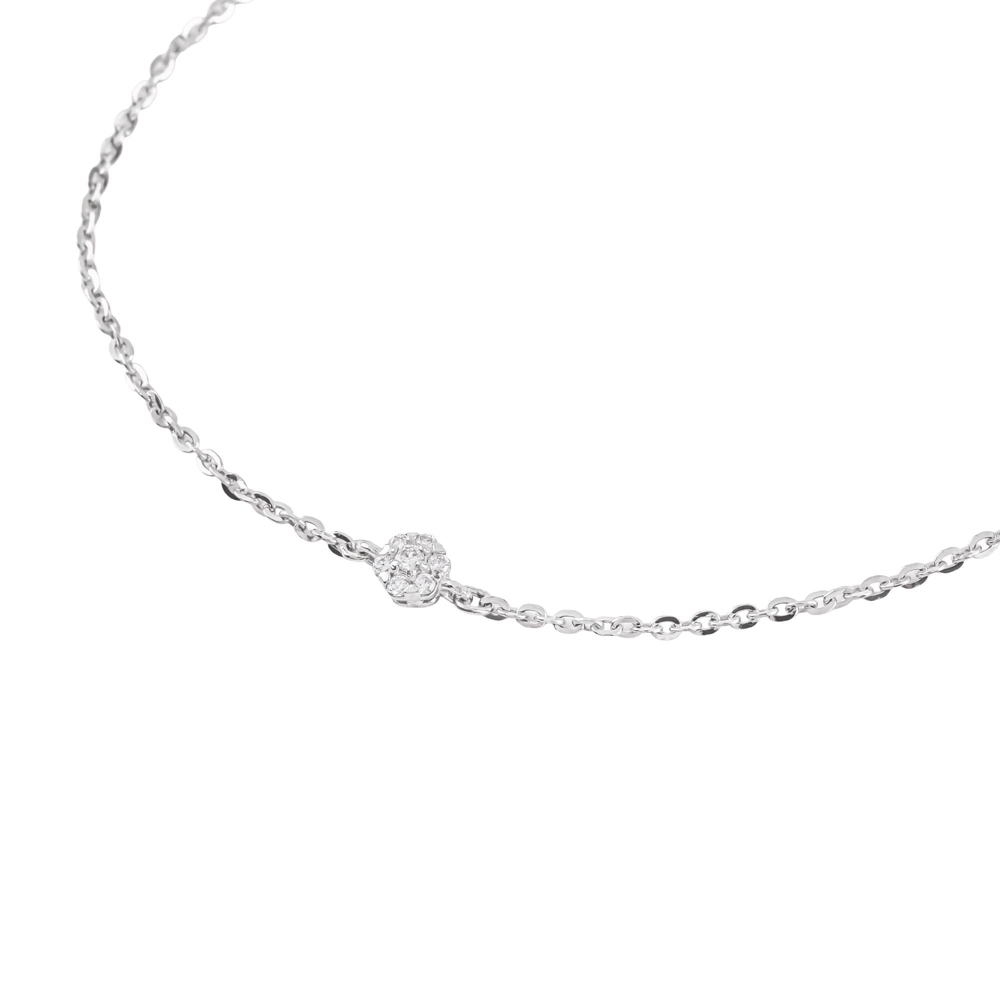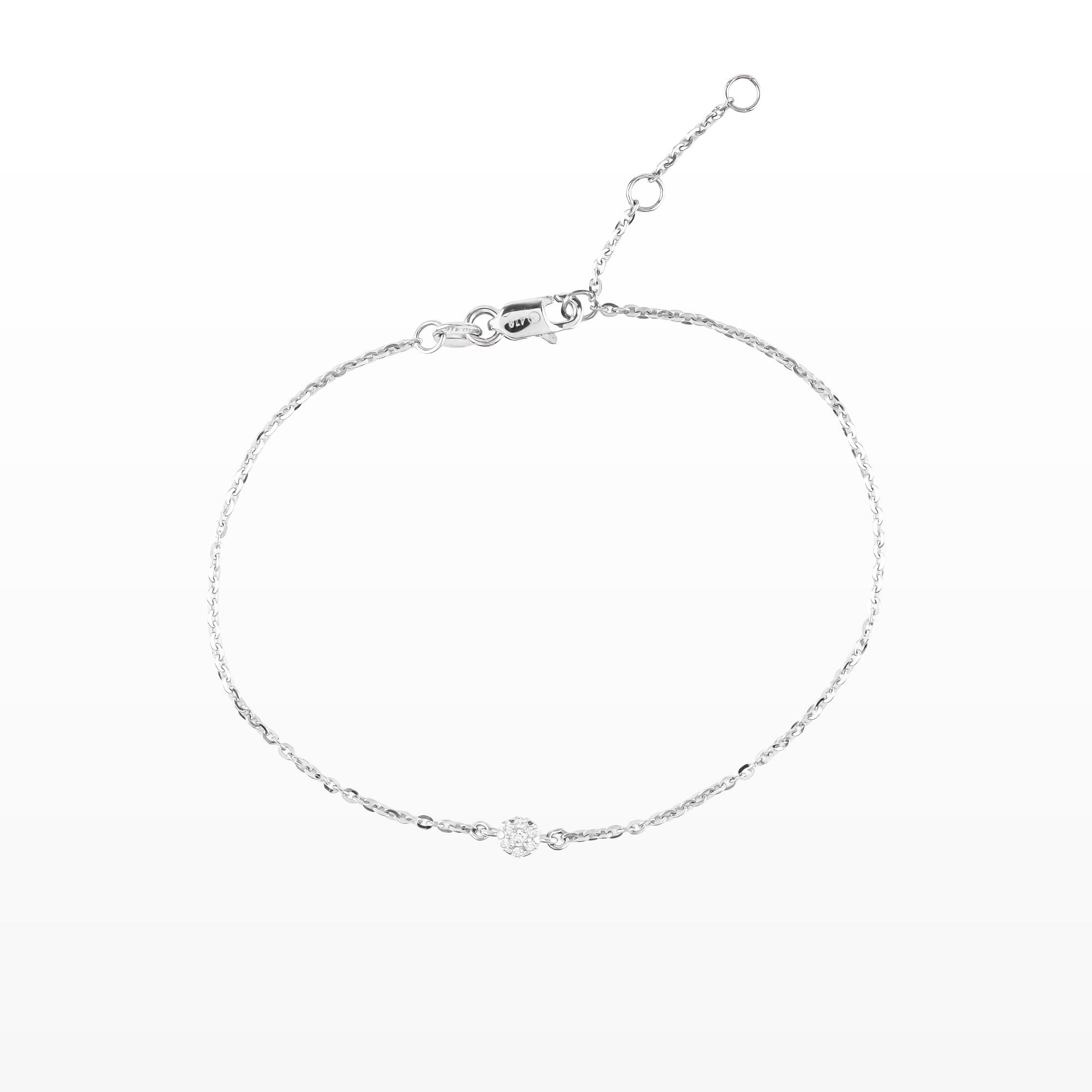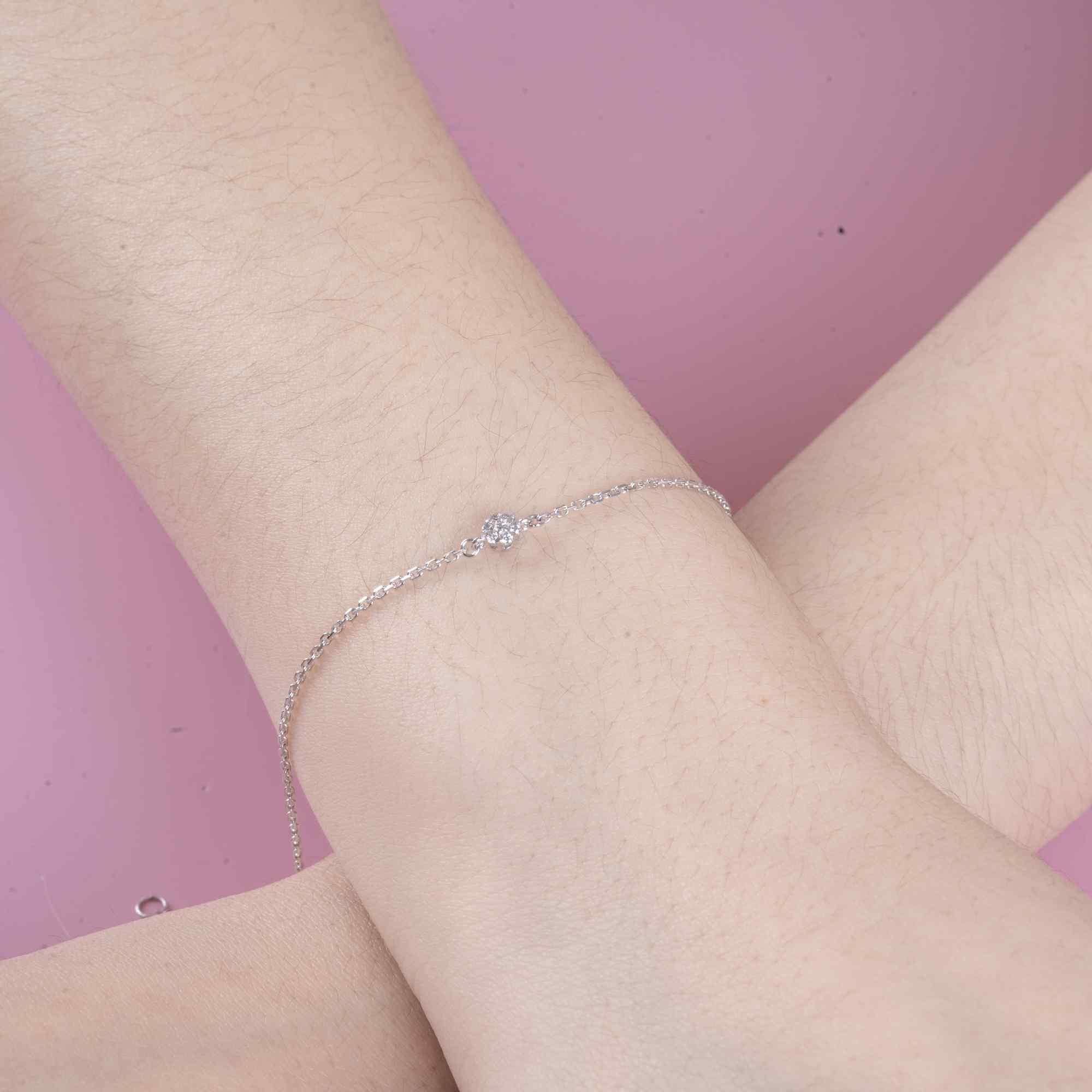 Mỗi chuyển động khẽ của cổ tay, viên kim cương lại phản chiếu ánh sáng rất tinh tế, mang đến cảm giác thanh khiết, nữ tính và đầy chiều sâu. Chiếc lắc không cố gắng nổi bật, mà chạm đến trái tim bằng sự giản dị và tinh xảo trong từng chi tiết.