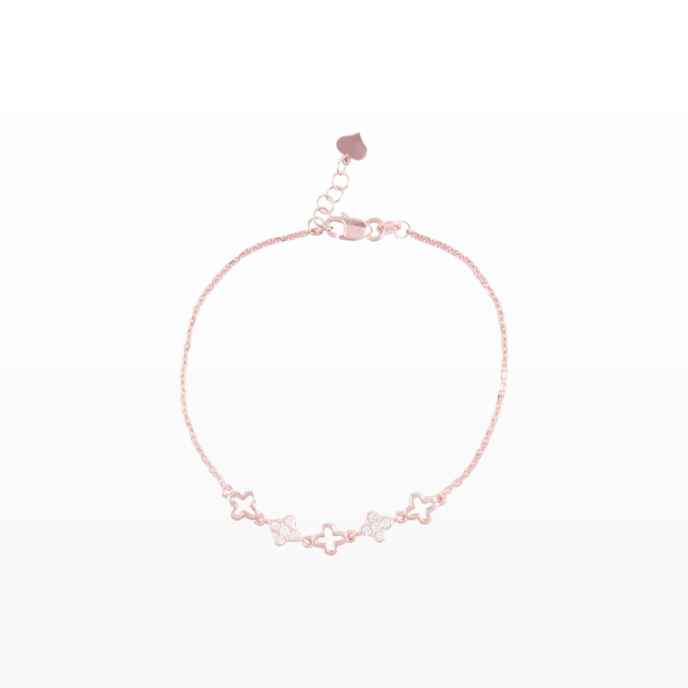 Chiếc lắc tay được thiết kế với những họa tiết hoa bốn cánh tinh xảo, biểu tượng của sự may mắn và hạnh phúc. Các chi tiết được sắp xếp hài hòa dọc theo dây, trong đó điểm nhấn là những bông hoa đính kim cương lấp lánh, tạo hiệu ứng ánh sáng nhẹ nhàng mỗi khi chuyển động.