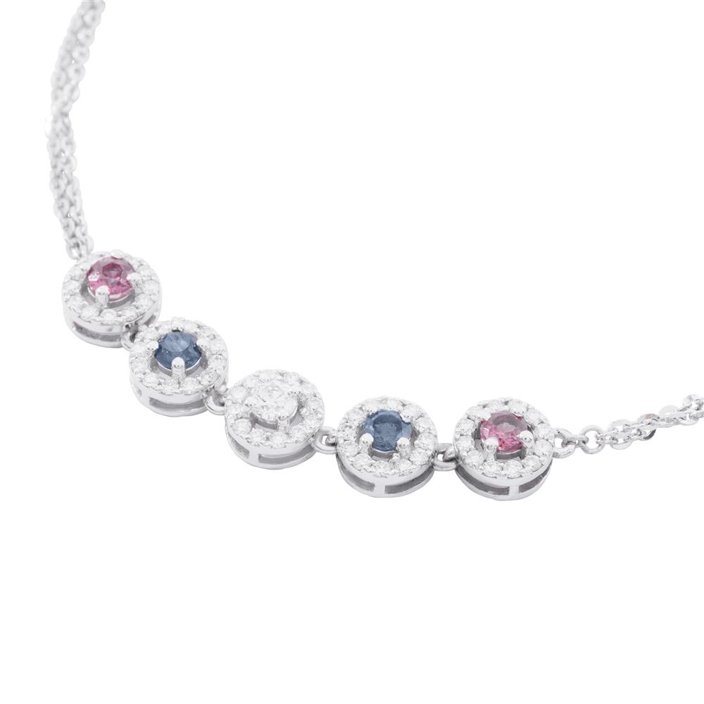 Một thiết kế đầy sức sống và sự tinh tế. Năm viên đá màu được xếp liền nhau trong khung viền tròn đính kim cương tấm, tạo hiệu ứng lấp lánh mềm mại, tươi sáng nhưng không hề phô trương. Sự xen kẽ hài hòa giữa các tone màu mang lại cảm giác trẻ trung, thanh lịch và đặc biệt tôn da.