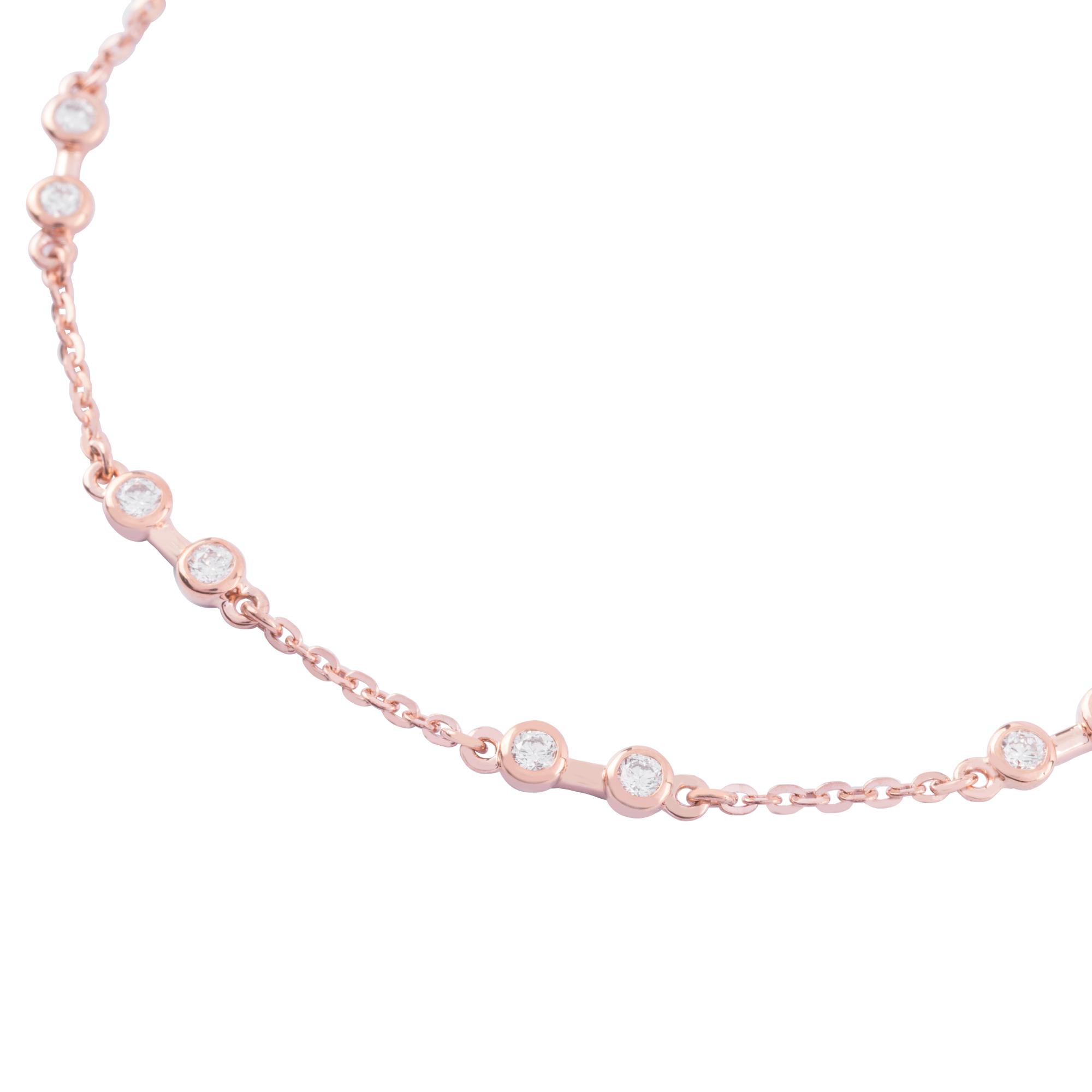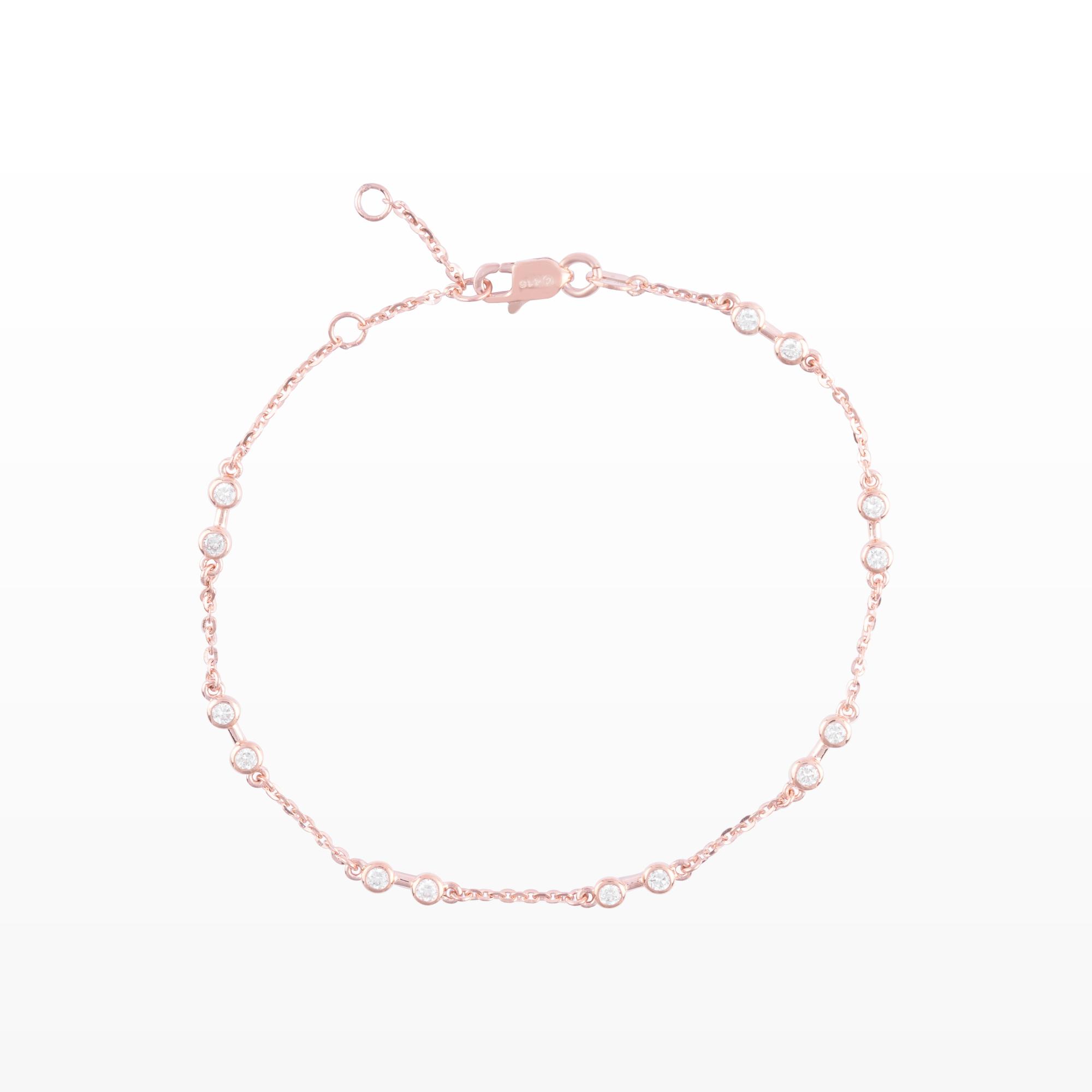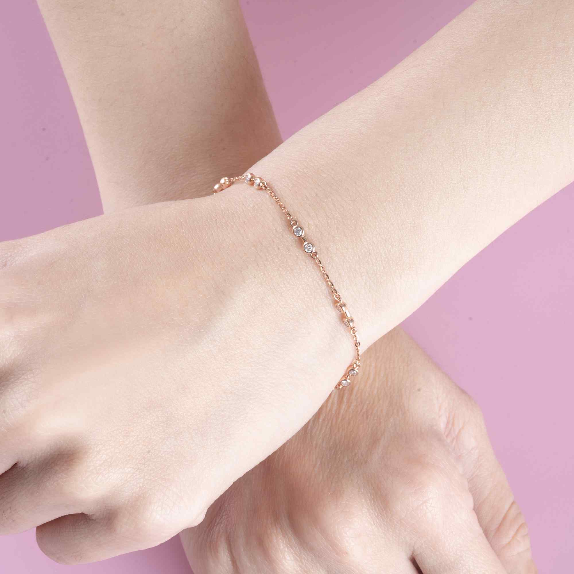 Chiếc lắc tay sở hữu thiết kế thanh mảnh với chuỗi mắt xích mềm mại, được điểm xuyết bởi những viên kim cương nhỏ lấp lánh sắp xếp đều quanh vòng tay. Từng viên kim cương được đính khéo léo trong viền kim loại tròn tinh tế, tạo nên hiệu ứng ánh sáng dịu dàng và sang trọng trong từng chuyển động.