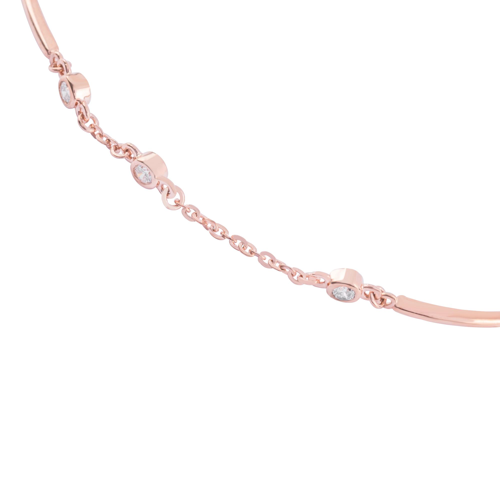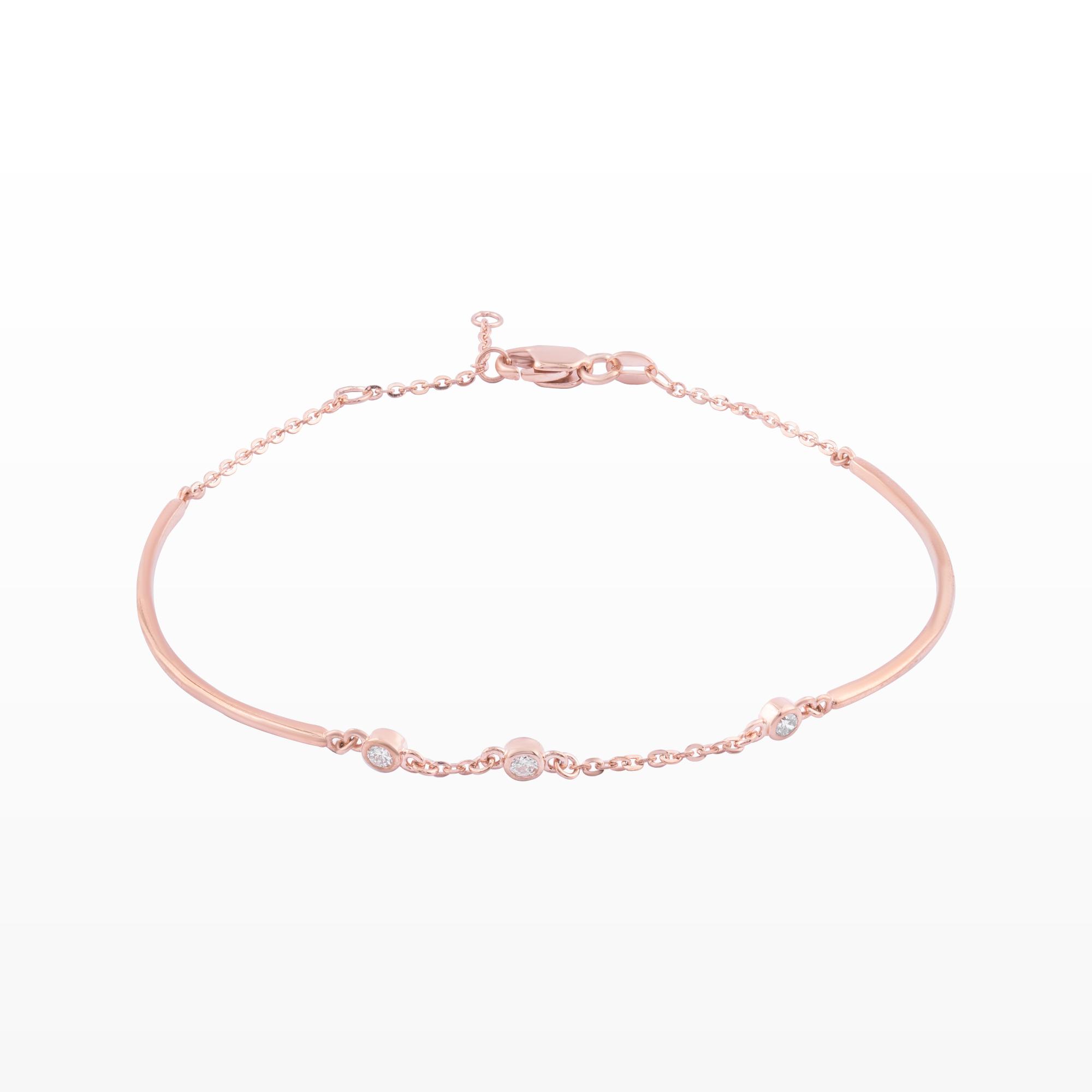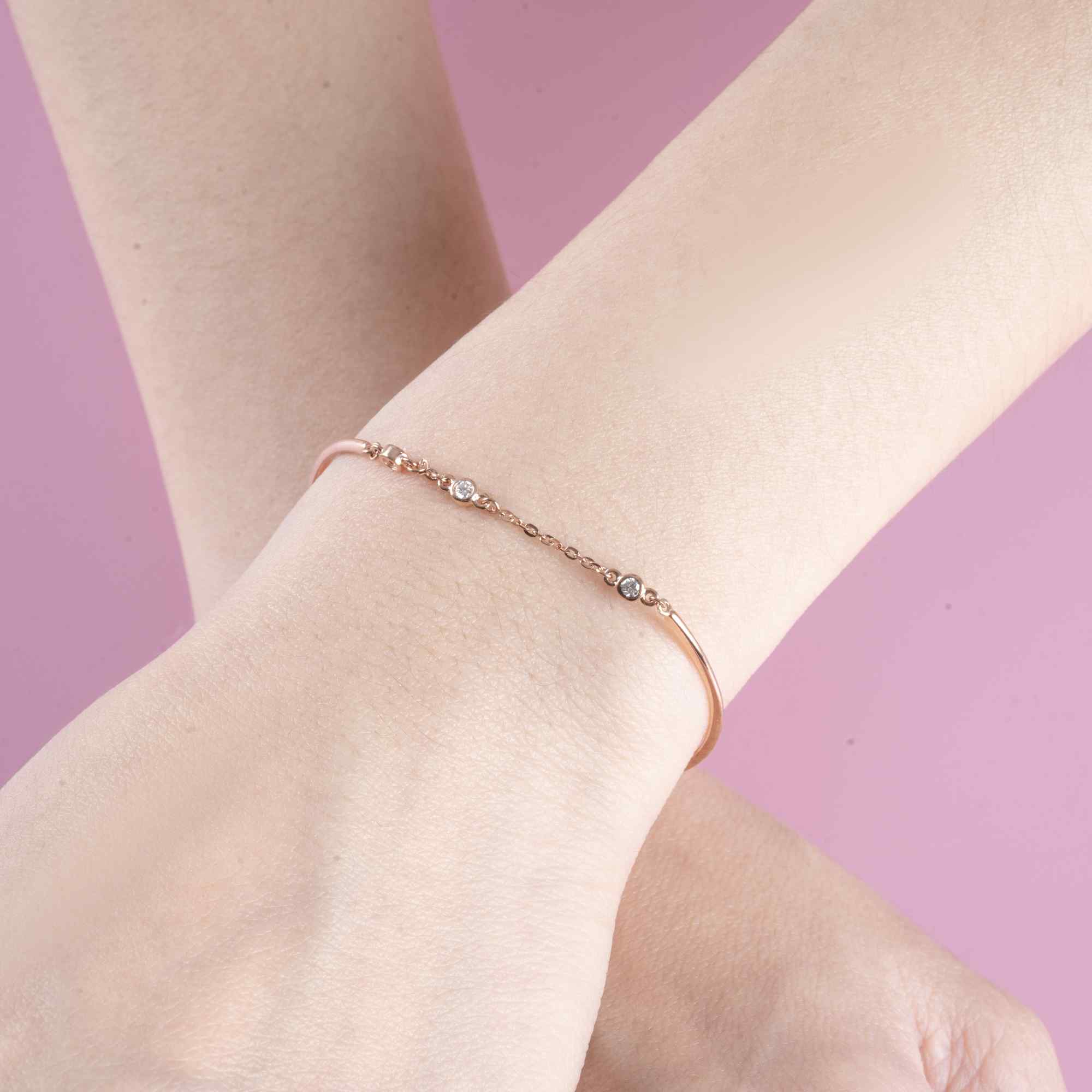 Chiếc lắc tay được thiết kế với phom dáng thanh mảnh, kết hợp hài hòa giữa phần khung trơn mềm mại và chuỗi mắt xích nhẹ nhàng, tạo nên tổng thể tinh tế và hiện đại. Những viên kim cương nhỏ được đính dọc theo phần dây, tỏa sáng dịu dàng trong từng chuyển động, mang đến vẻ đẹp thanh lịch nhưng vẫn đầy cuốn hút.