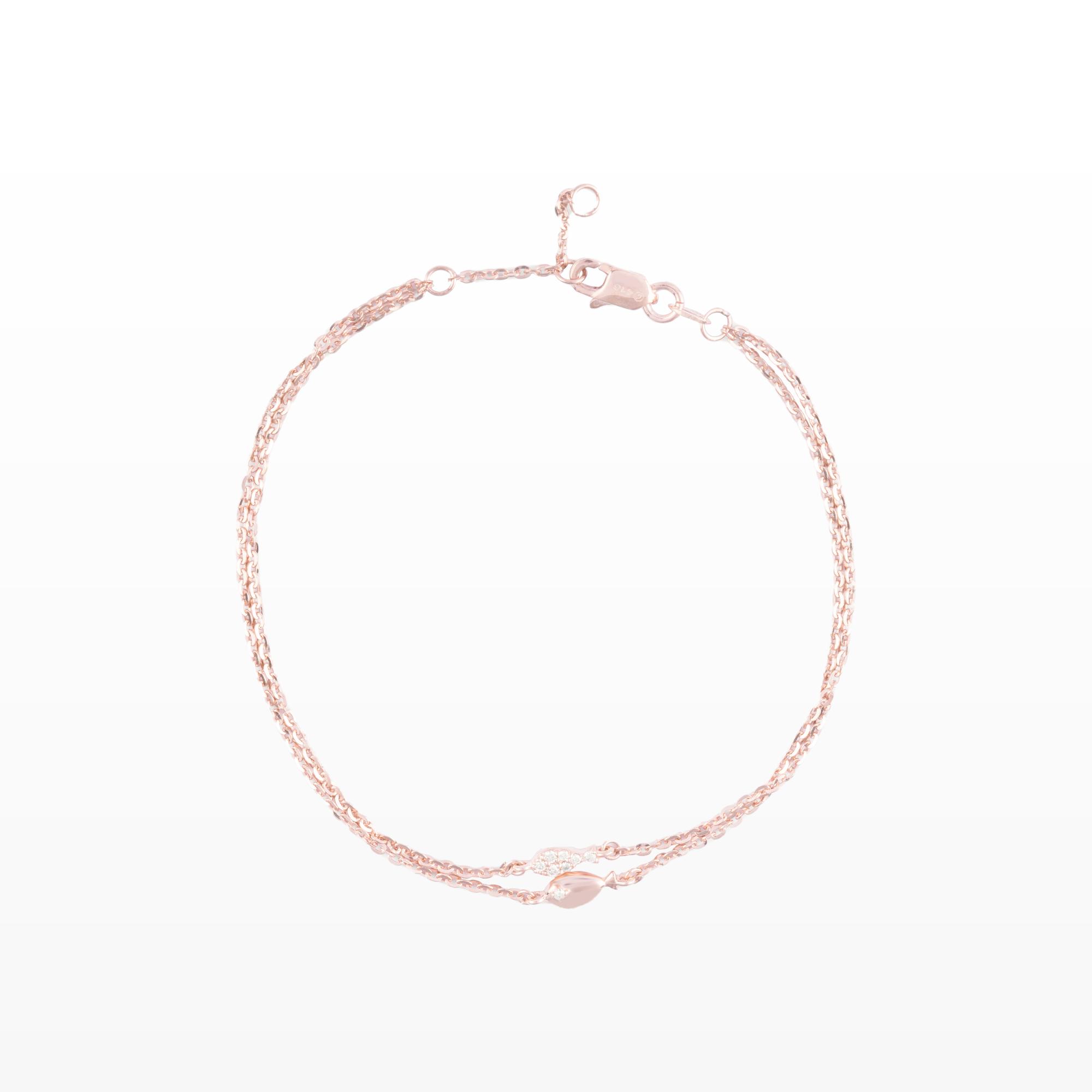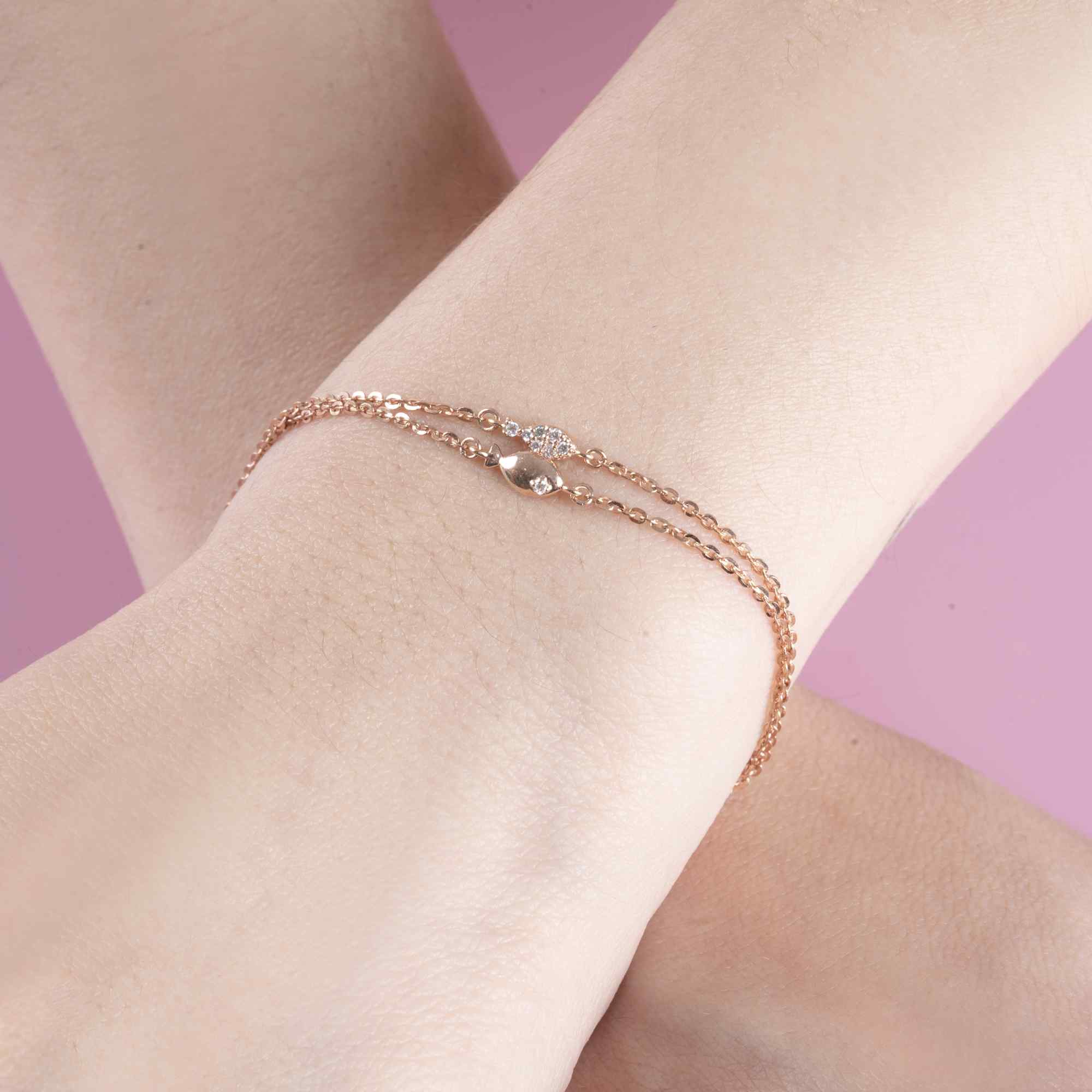Chiếc lắc tay được thiết kế với hai lớp dây mảnh đan xen tinh tế, tạo nên hiệu ứng mềm mại và thanh thoát khi ôm nhẹ cổ tay. Điểm nhấn ở trung tâm là cụm kim cương nhỏ lấp lánh kết hợp cùng chi tiết kim loại hình con cá, mang lại vẻ đẹp dịu dàng nhưng vẫn đầy cuốn hút.