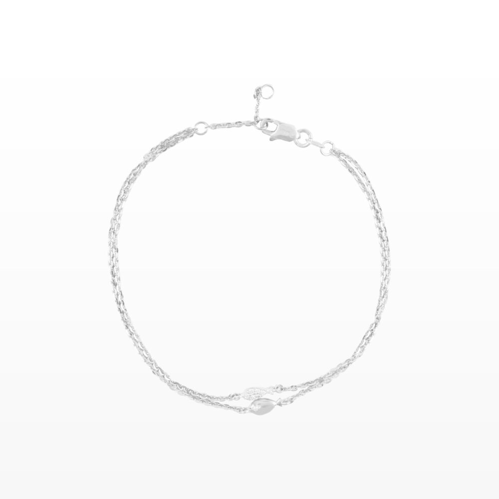 Chiếc lắc tay được thiết kế với hai lớp dây mảnh đan xen tinh tế, tạo nên hiệu ứng mềm mại và thanh thoát khi ôm nhẹ cổ tay. Điểm nhấn ở trung tâm là cụm kim cương nhỏ lấp lánh kết hợp cùng chi tiết kim loại hình con cá, mang lại vẻ đẹp dịu dàng nhưng vẫn đầy cuốn hút.