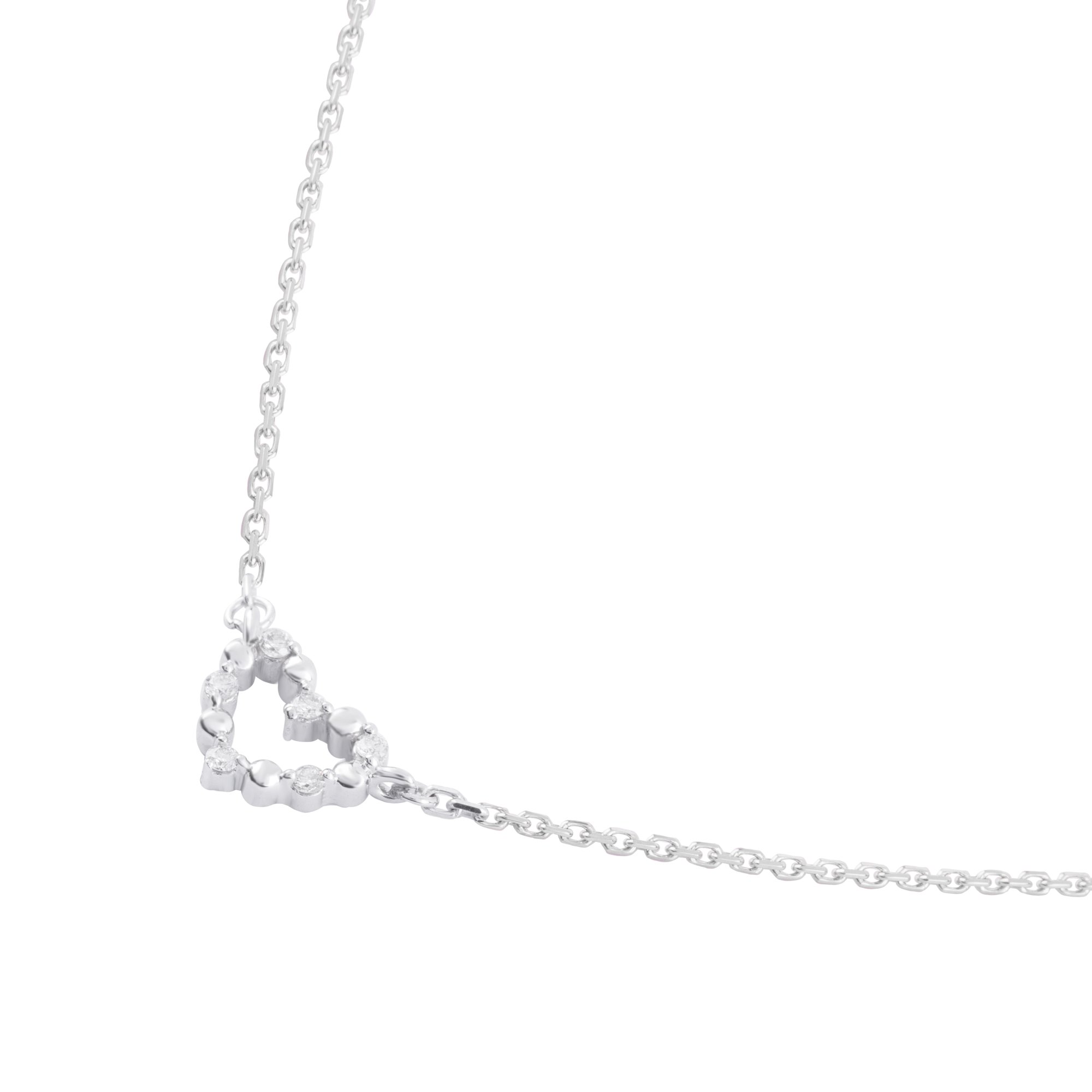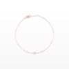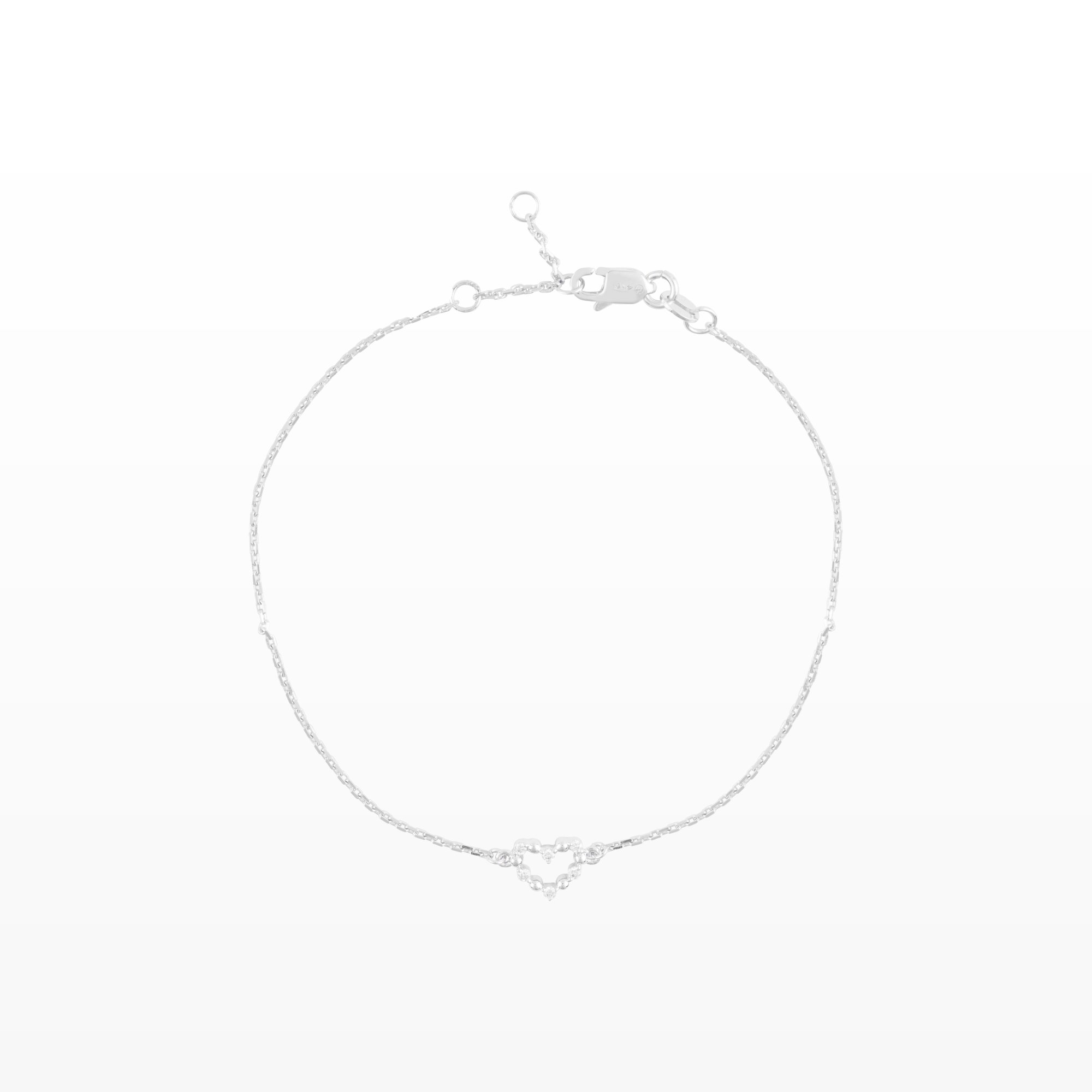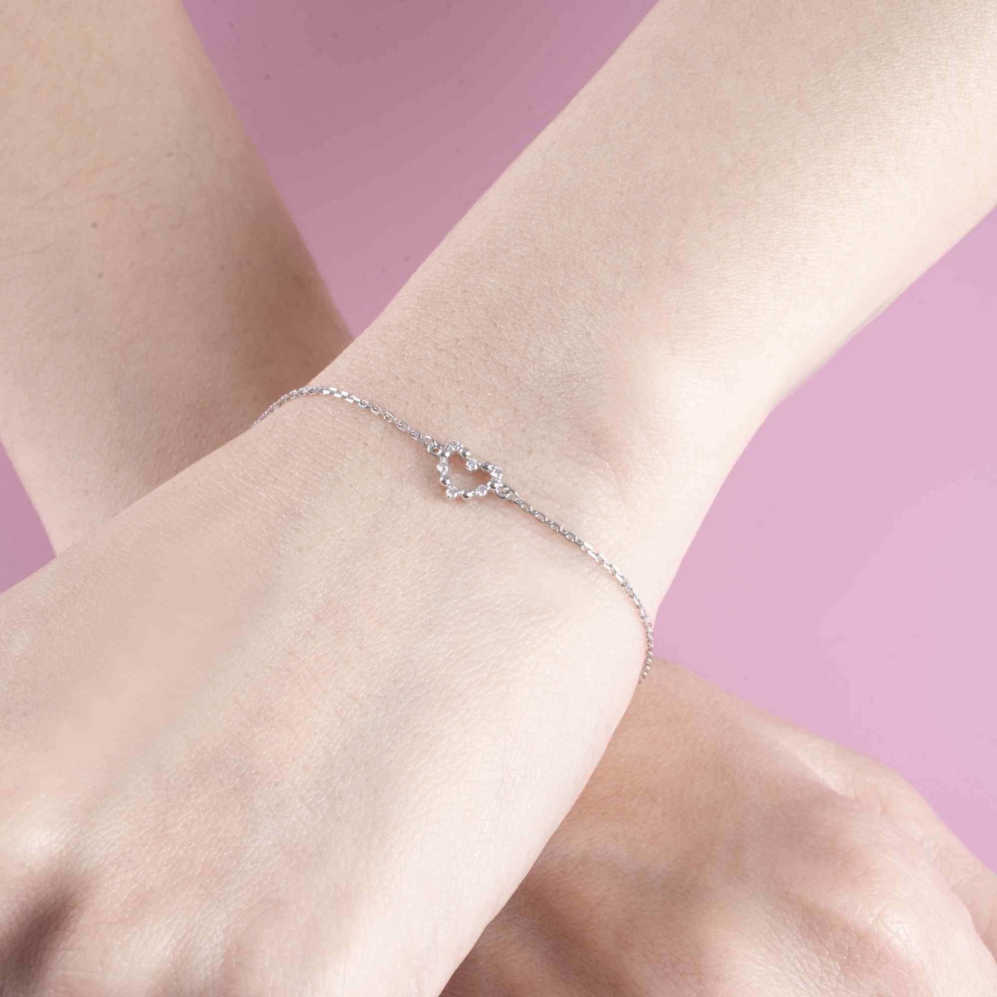 Chiếc lắc tay mang thiết kế thanh mảnh với sợi dây vàng trắng tinh tế, nhẹ nhàng ôm trọn cổ tay. Điểm nhấn ở trung tâm là họa tiết trái tim nhỏ được kết từ những viên kim cương lấp lánh, tạo nên hiệu ứng ánh sáng dịu dàng và đầy cuốn hút.