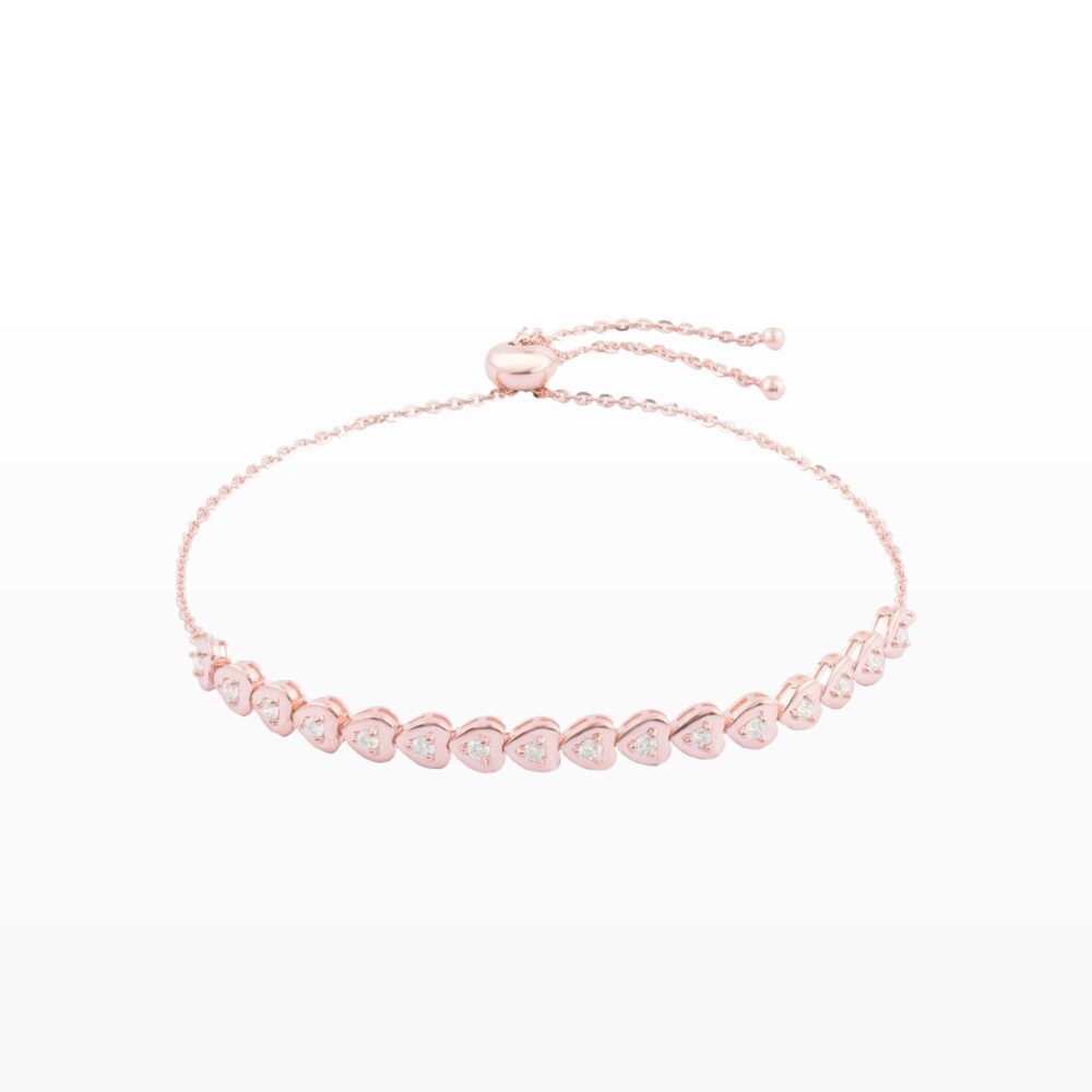 Thiết kế vòng tay nổi bật với chuỗi trái tim nhỏ xinh được sắp xếp liền mạch, mỗi trái tim đính kim cương lấp lánh ở trung tâm như một nhịp yêu thương không ngừng nối tiếp. Sắc vàng hồng ấm áp tôn lên vẻ nữ tính, mềm mại và đầy cuốn hút.