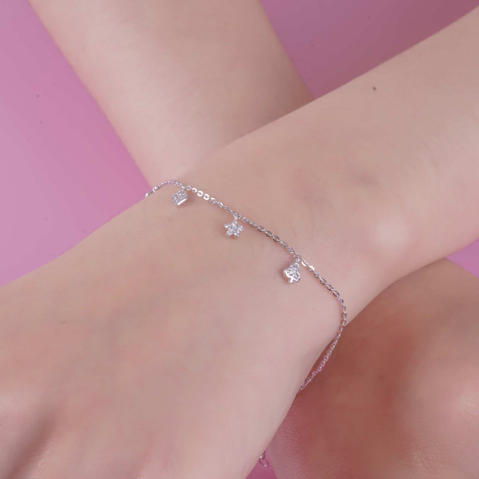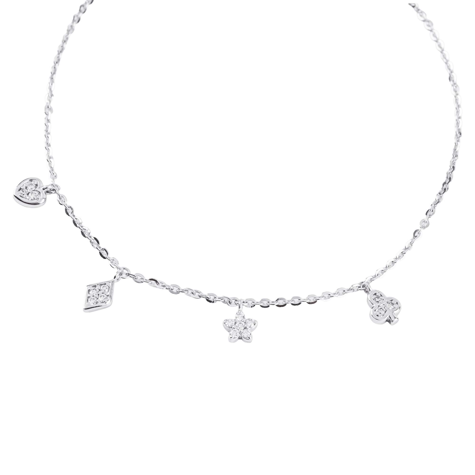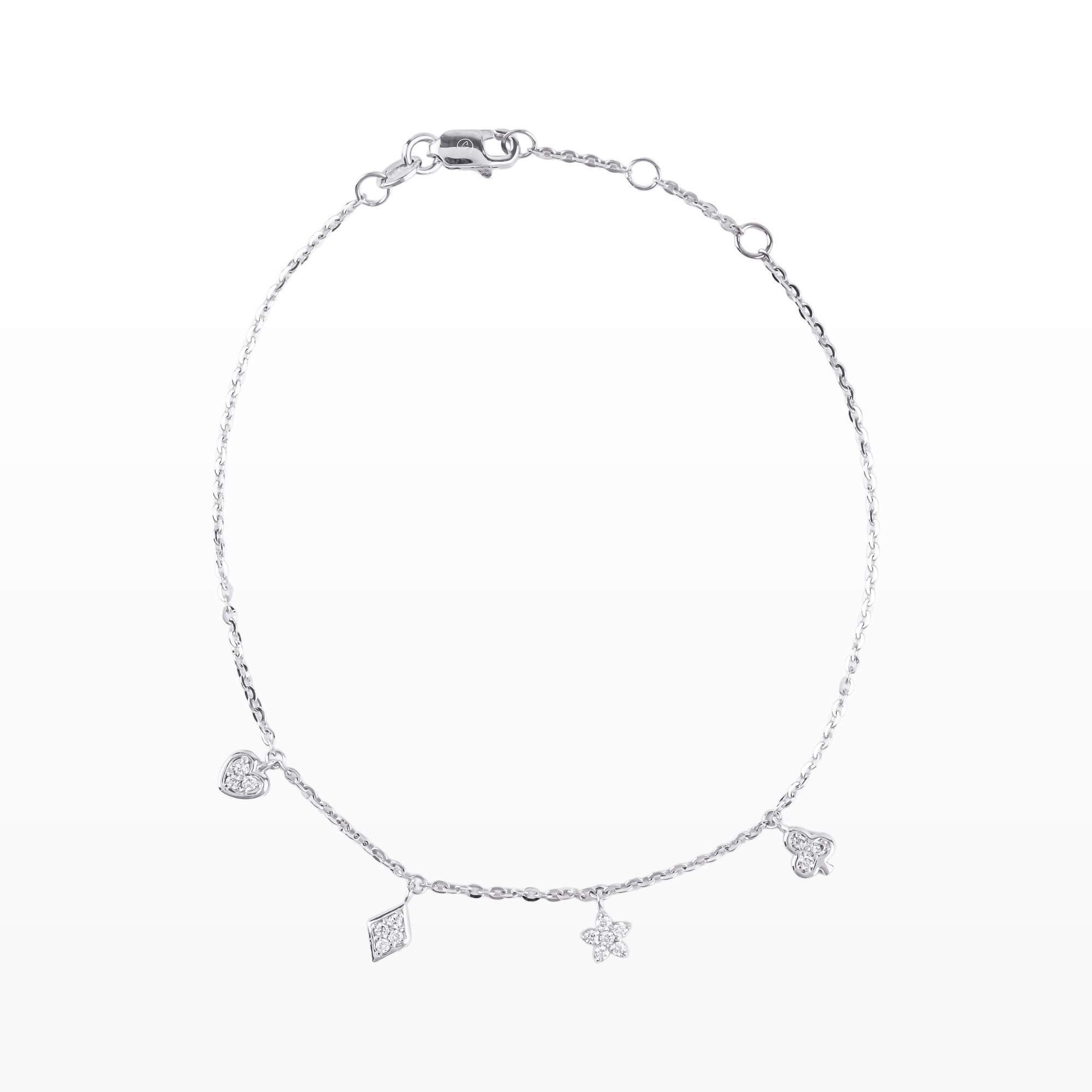 Lắc tay vàng trắng thiết kế thanh mảnh với các charm đính kim cương tinh tế như trái tim và hình thoi cách điệu. Kiểu dáng nhẹ nhàng, trẻ trung, tạo điểm nhấn lấp lánh cho cổ tay. Phù hợp đeo hằng ngày hoặc làm quà tặng ý nghĩa.