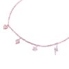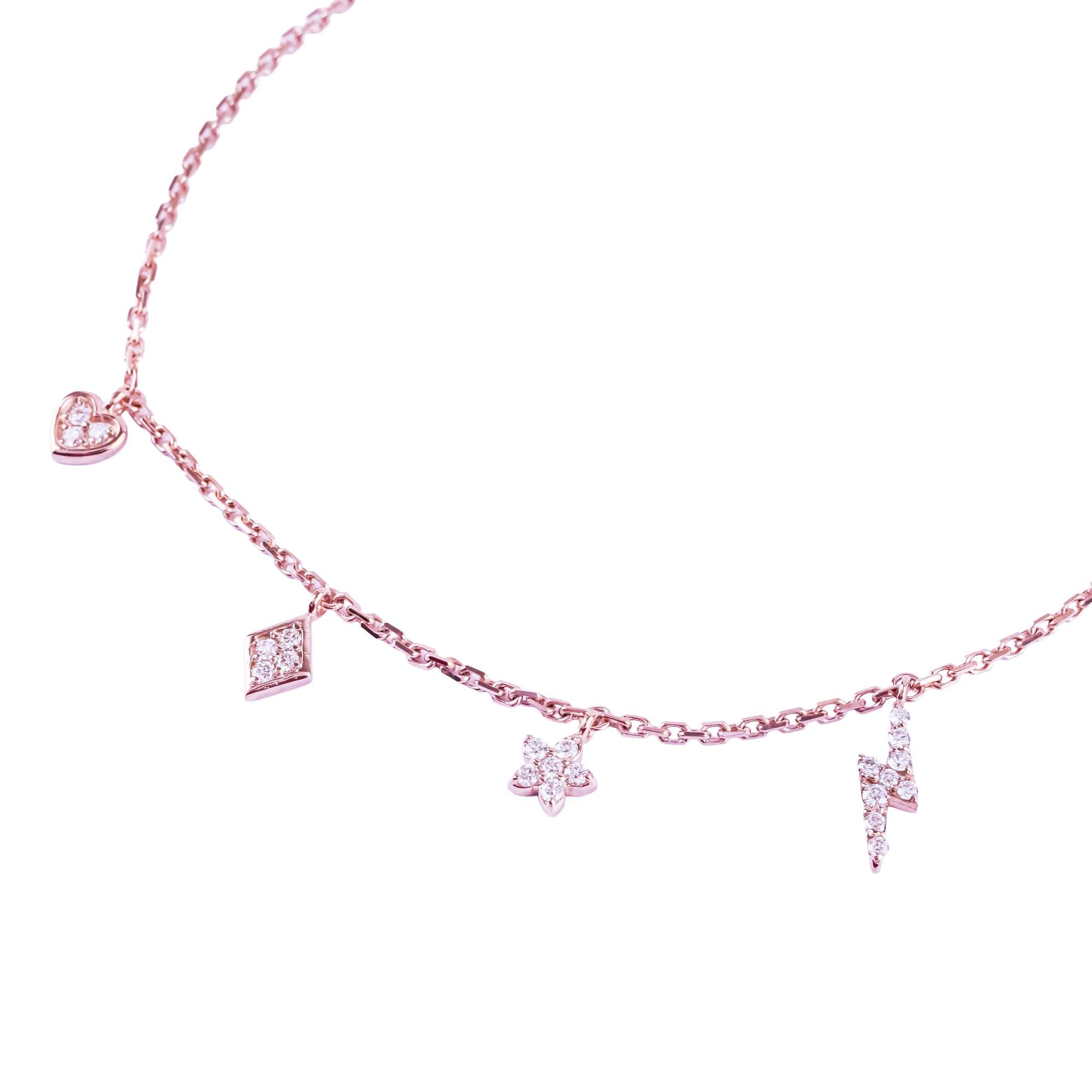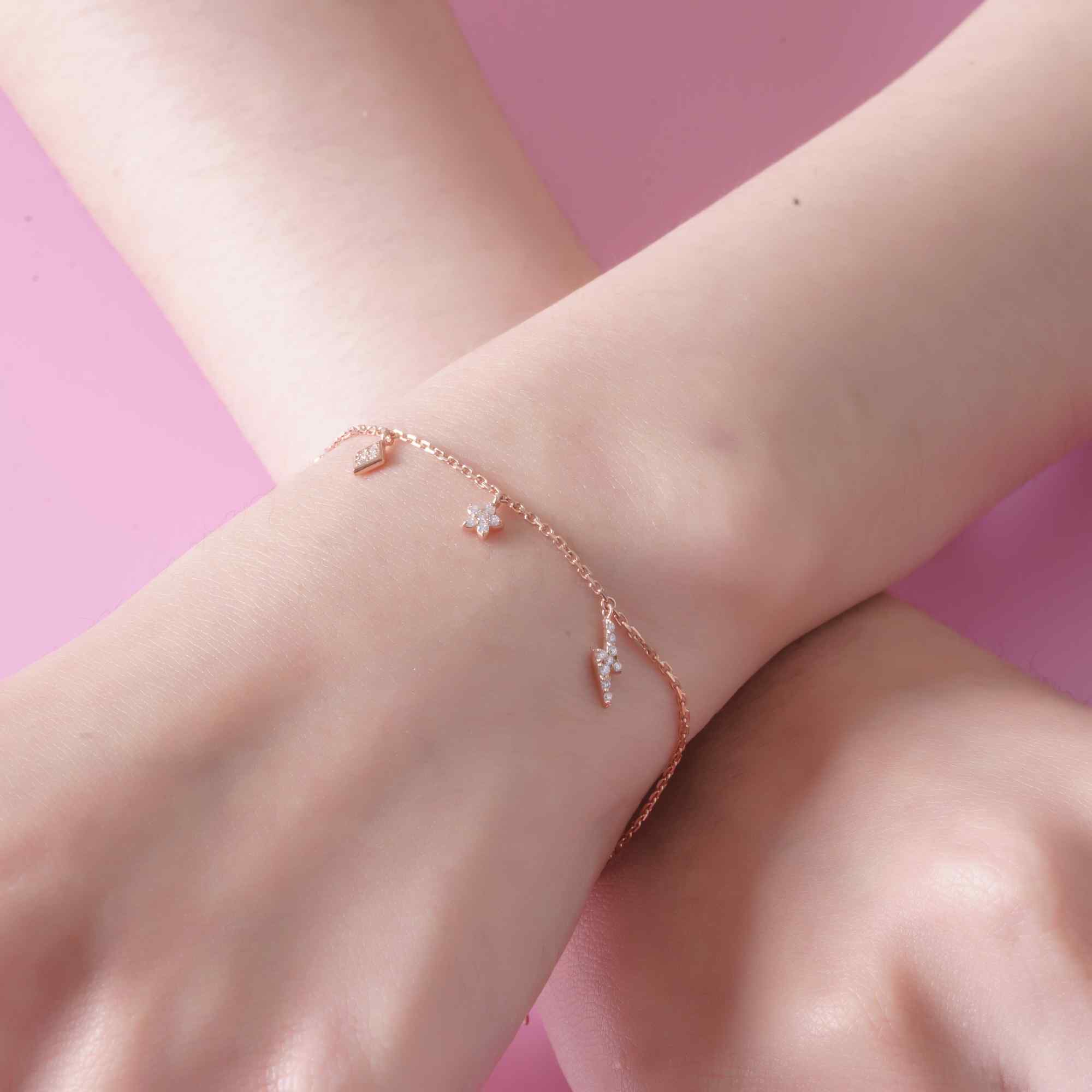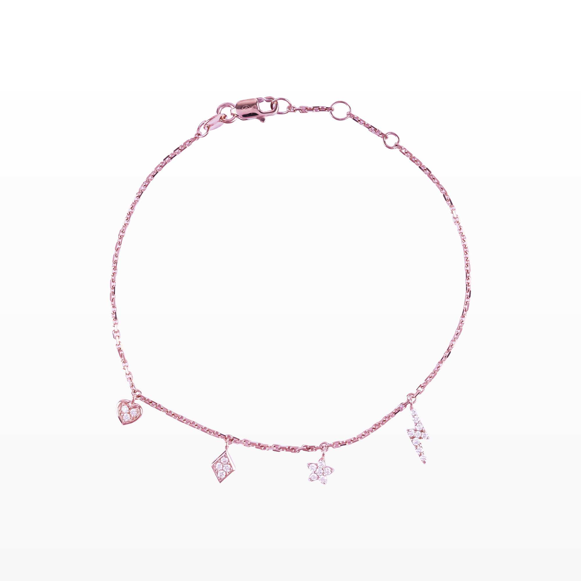 Lắc tay vàng hồng thiết kế thanh mảnh với các charm kim cương nhỏ xinh như trái tim, hình thoi, bông hoa và tia sét cách điệu. Kiểu dáng trẻ trung, nữ tính, tạo điểm nhấn lấp lánh tinh tế cho cổ tay. Phù hợp đeo hằng ngày hoặc làm quà tặng đáng yêu.