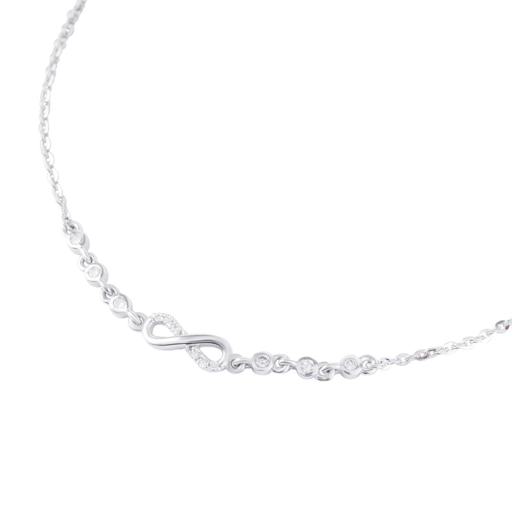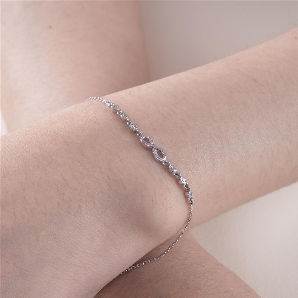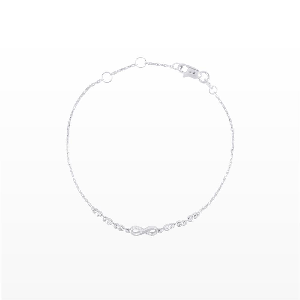 Mang thiết kế dây mảnh thanh thoát, ôm nhẹ cổ tay tạo cảm giác tinh tế và hiện đại. Điểm nhấn nổi bật là biểu tượng vô cực (∞) nhỏ gọn, được chế tác tinh xảo và đính kèm những viên kim cương tấm sáng lấp lánh chạy dọc hai bên tạo hiệu ứng “đường sáng” mềm mại, giúp chiếc vòng tay tỏa sáng nhẹ nhàng mà vẫn vô cùng sang trọng