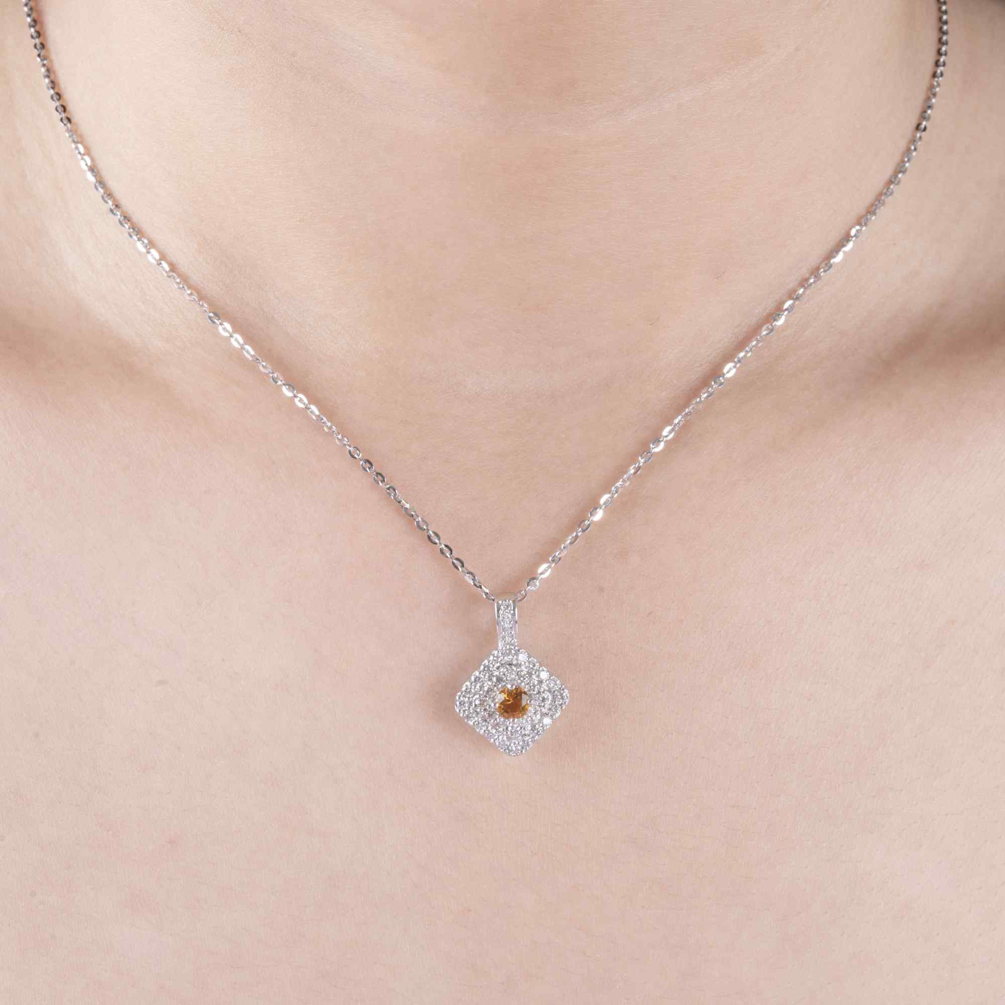 Viên Citrine ấm áp ở trung tâm tỏa sáng như ngọn lửa nhỏ của cảm xúc chân thành, được bao bọc bởi vòng kim cương tấm lấp lánh – biểu tượng của sự che chở và bền bỉ. Thiết kế dáng vuông bo góc mang lại cảm giác vững vàng, hài hòa giữa nét mạnh mẽ và sự dịu dàng.