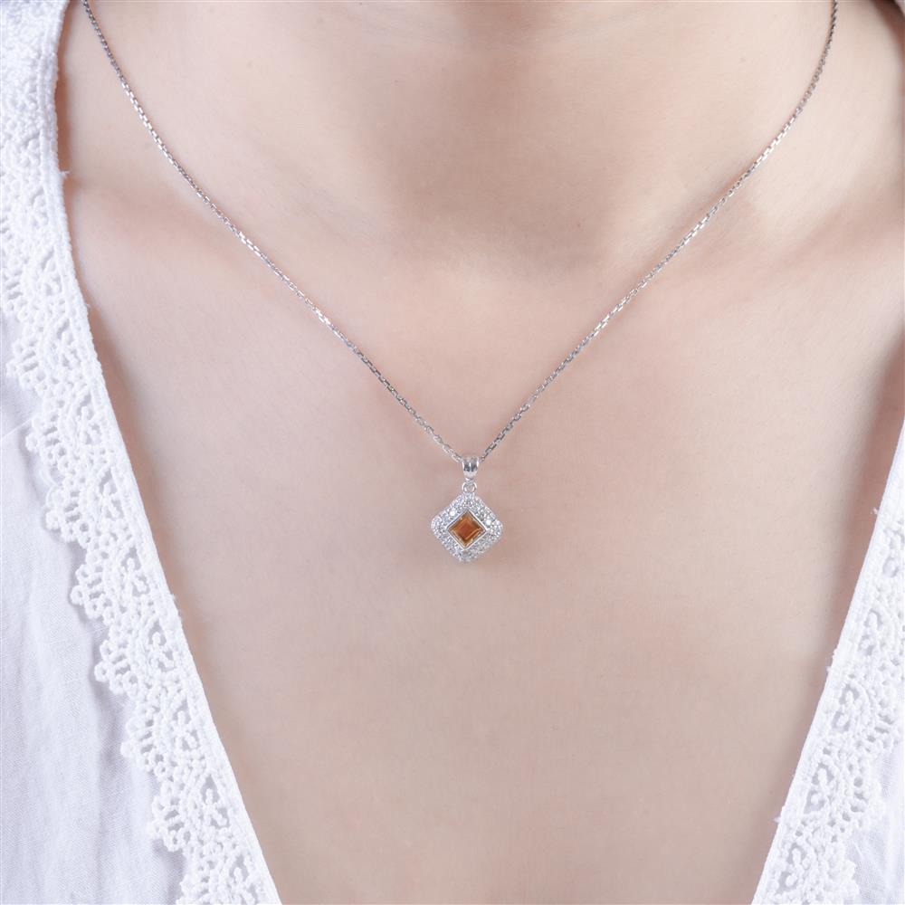 Thiết kế mặt dây chuyền nổi bật với viên đá Citrine dáng vuông cắt sắc nét, tỏa sắc vàng ấm áp và rực rỡ. Bao quanh đá chủ là vòng kim cương tấm kiểu halo, giúp tăng hiệu ứng ánh sáng và làm viên đá trở nên nổi bật, thu hút hơn từ mọi góc nhìn.