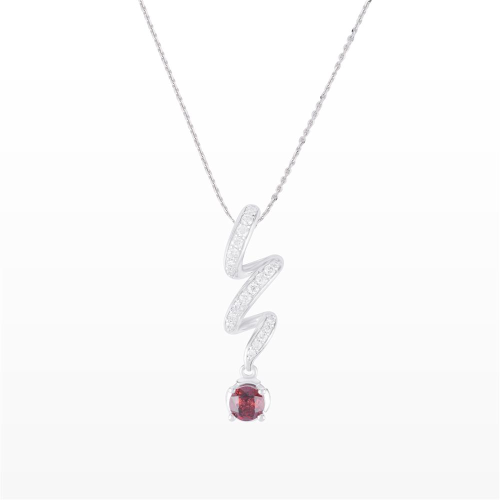 Điểm nhấn nổi bật là viên đá đỏ garnet được đặt ở vị trí cuối cùng của đường xoắn, như một “trái tim rực cháy” đang tỏa sáng giữa dải sao đêm. Màu đỏ sâu cuốn hút gợi cảm giác về đam mê, sự tự tin và tình yêu mãnh liệt — hoàn hảo cho những ai muốn khẳng định bản sắc riêng, vừa mạnh mẽ vừa quyến rũ.