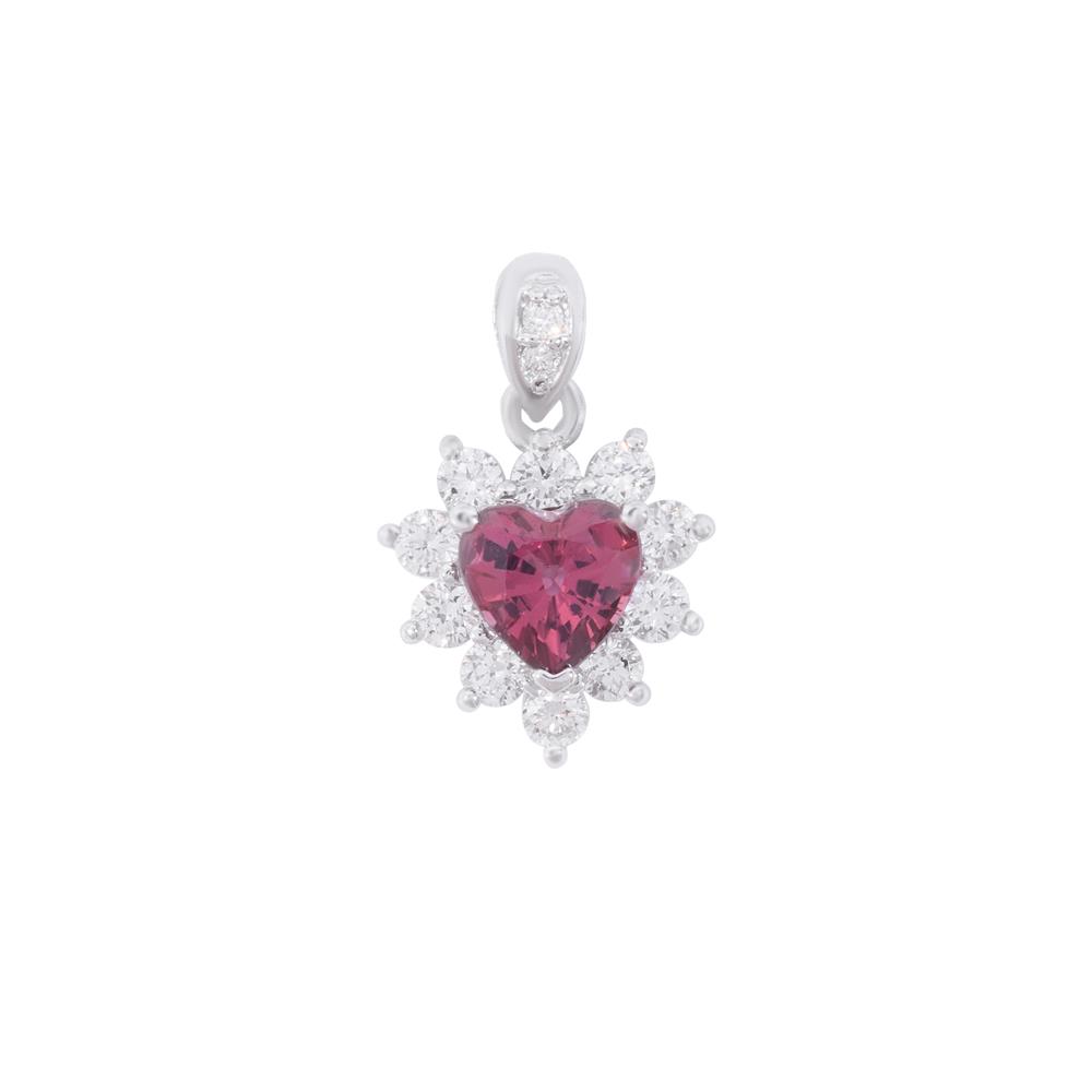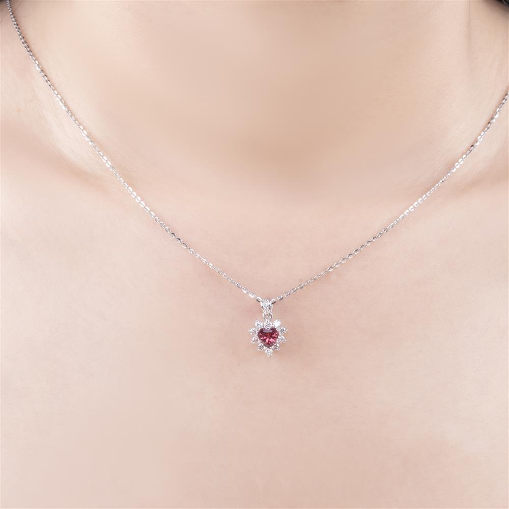 Tựa như một bông hoa đang nở giữa ánh sáng, mặt dây chuyền nổi bật với viên đá Garnet hình trái tim – biểu tượng của tình yêu, sự nữ tính và những cảm xúc tinh khôi. Bao quanh là những viên đá trắng được sắp xếp tinh xảo, tạo thành quầng sáng lấp lánh như hào quang ôm trọn trái tim rực rỡ.