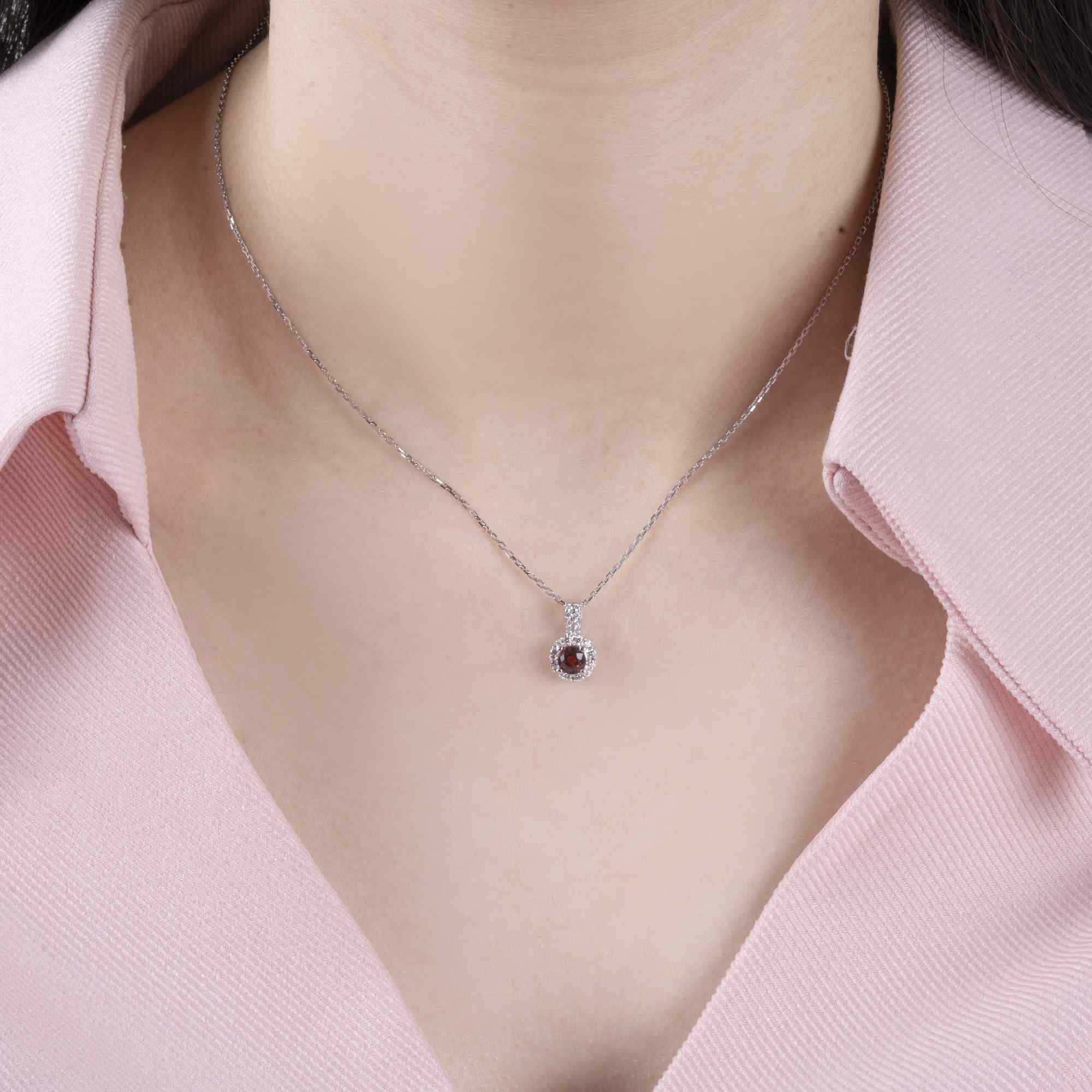 Viên đá đỏ thẫm ở trung tâm tựa nhịp tim ấm nóng, mang sắc độ sâu và đầy cảm xúc. Đó là màu của đam mê, của tình yêu mãnh liệt nhưng chín chắn, của những rung động không ồn ào mà ở lại rất lâu. Bao quanh viên đá là vòng kim cương nhỏ lấp lánh, như ánh sáng dịu dàng nâng niu và tôn vinh nét đẹp riêng biệt ấy.