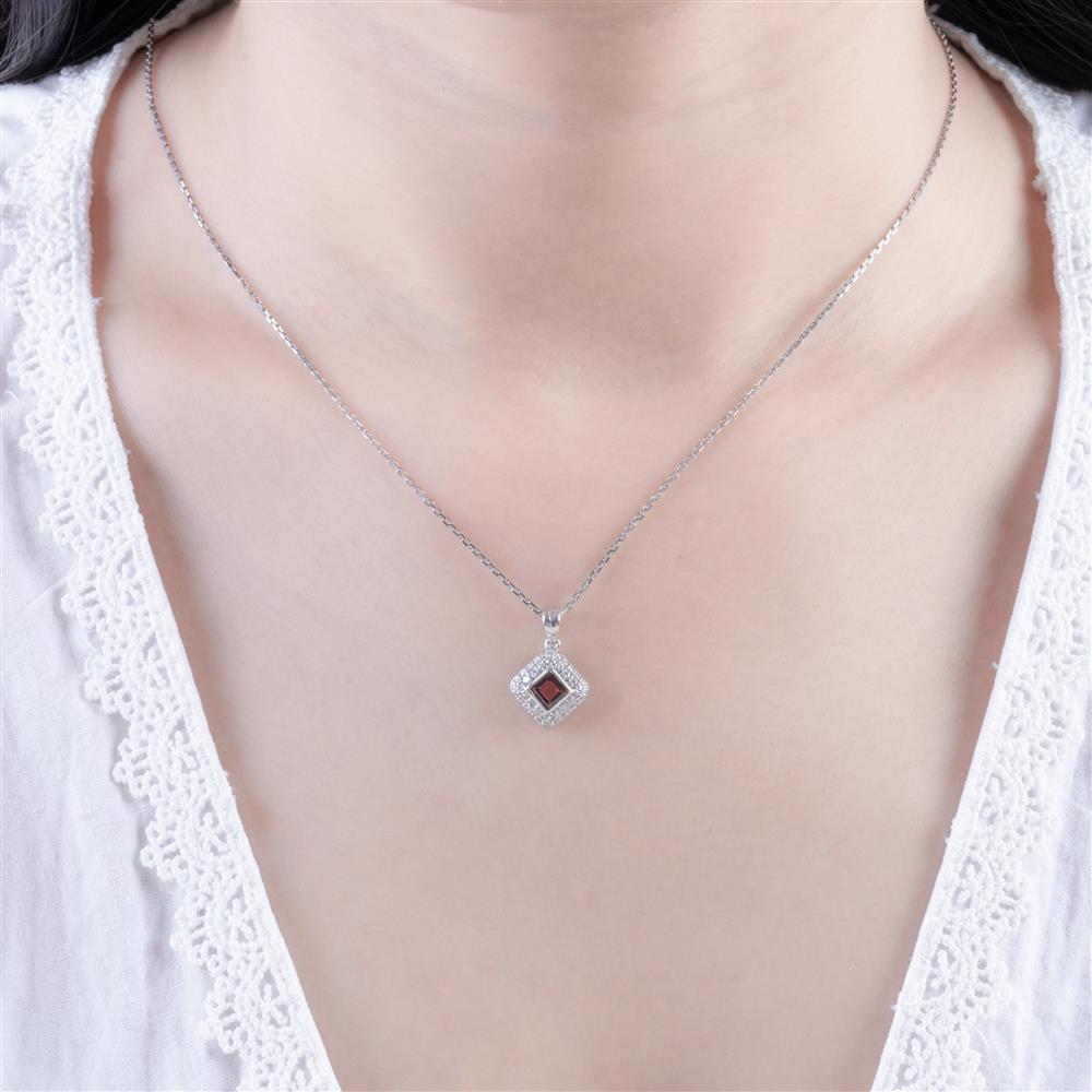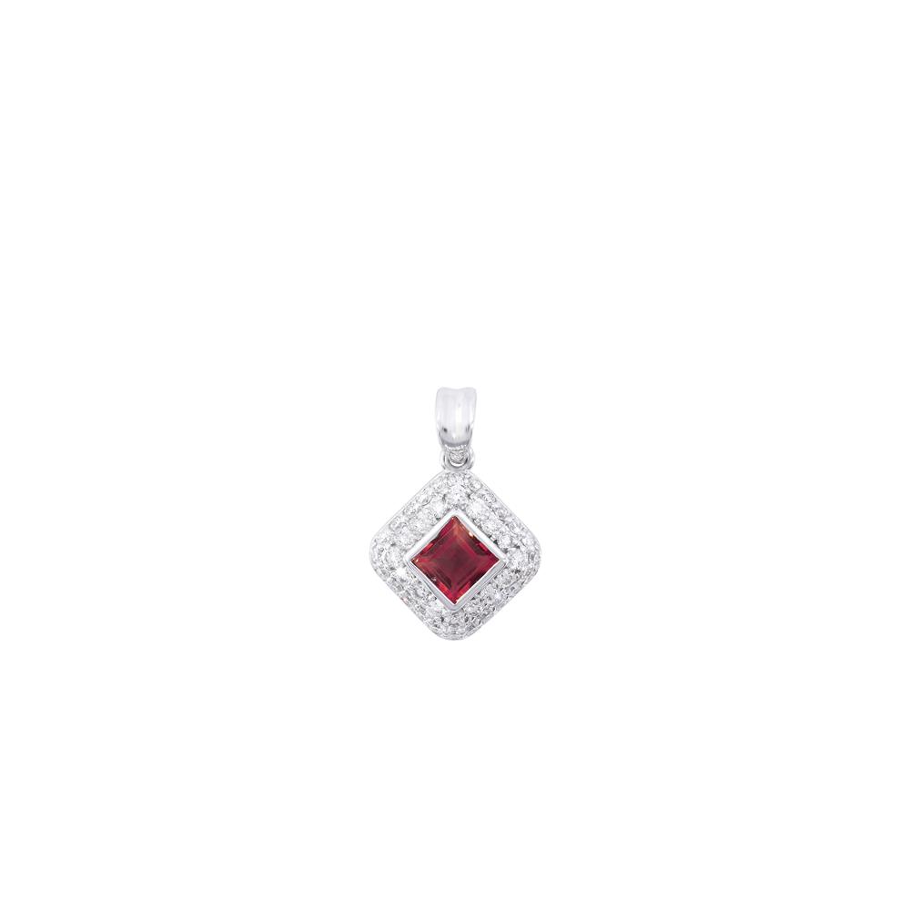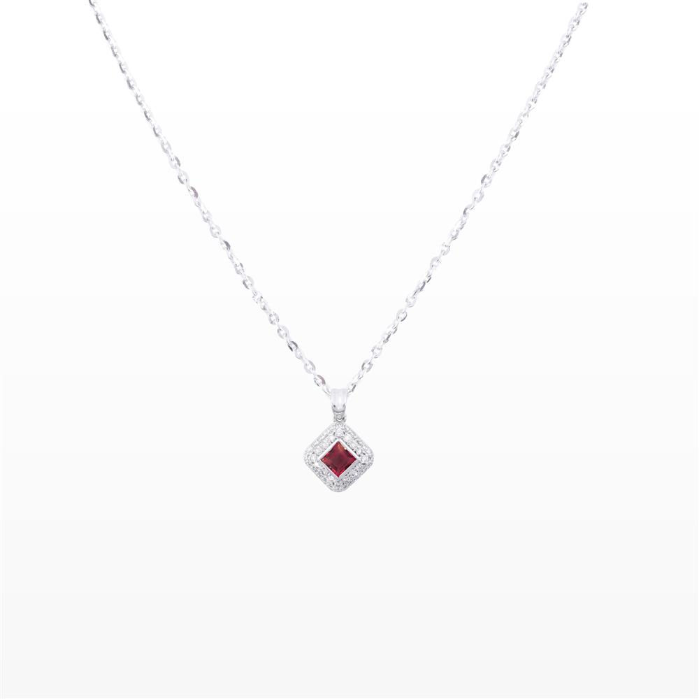 Mẫu dây chuyền gây ấn tượng mạnh với mặt đá đỏ cắt vuông sắc nét, đặt ở trung tâm như một điểm nhấn đầy cuốn hút. Bao quanh là viền kim cương nhỏ lấp lánh, được đính tỉ mỉ, tạo hiệu ứng ánh sáng nổi bật và tôn lên chiều sâu của viên đá chủ. Sự kết hợp hài hòa giữa hình khối vuông vức và ánh đỏ quyến rũ mang đến cảm giác sang trọng, bản lĩnh và đầy khí chất.