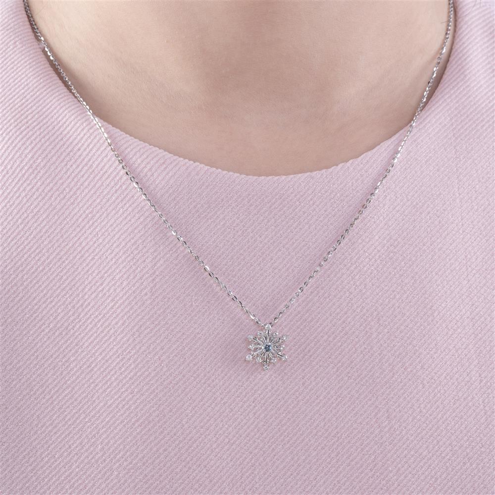 Thiết kế lấy cảm hứng từ bông tuyết mùa đông, nơi mỗi cánh hoa đều mang một cấu trúc riêng biệt và tinh tế. Ở trung tâm, viên đá xanh trong vắt nổi bật như trái tim của mùa đông—lạnh, tinh khiết nhưng đầy sức hút. Ánh xanh dịu nhẹ gợi liên tưởng đến những ngày trời trong veo, mang đến cảm giác thư thái, bình yên nhưng vẫn thật quyến rũ.