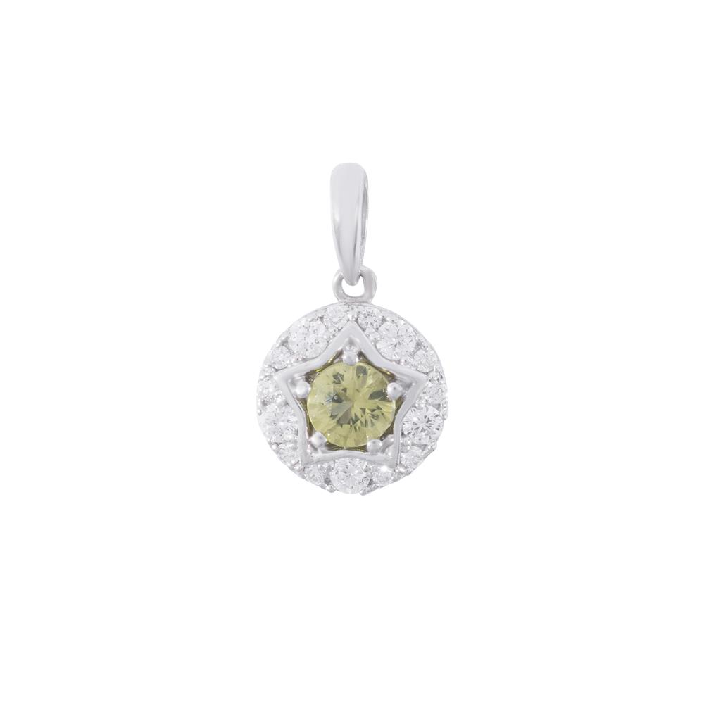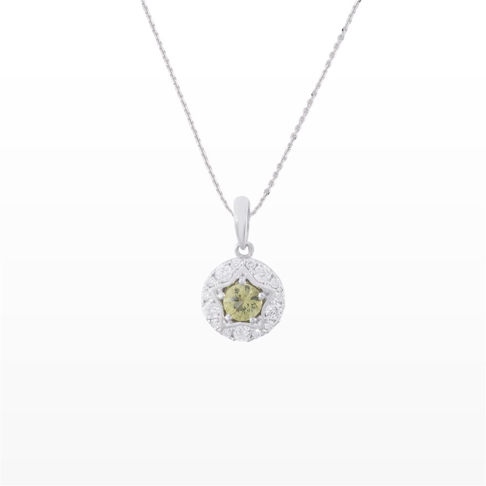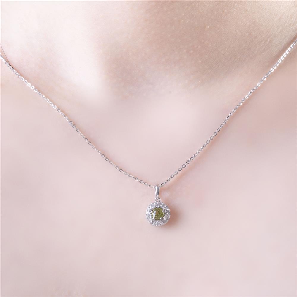 Tâm điểm của thiết kế là viên Peridot xanh lục mềm mại, sắc xanh như giọt nắng chạm vào lá non, mang đến cảm giác tươi mới và đầy sức sống. Được đặt ngay giữa khung ngôi sao tinh xảo, viên Peridot tỏa sáng nổi bật, tạo hiệu ứng lấp lánh đầy cuốn hút.
