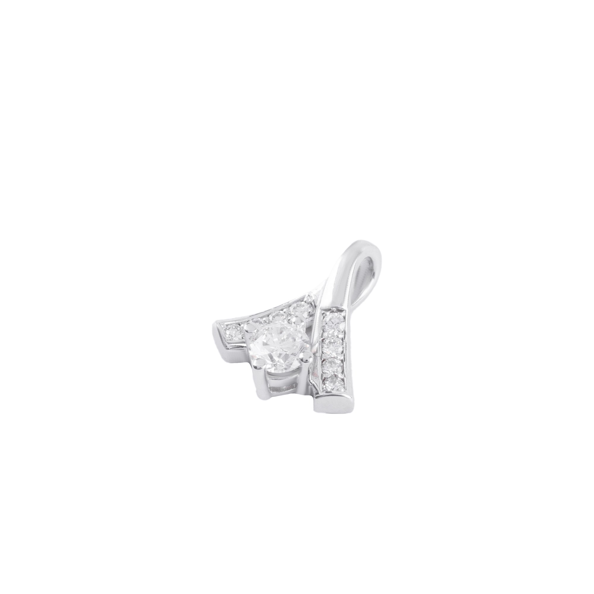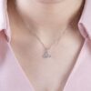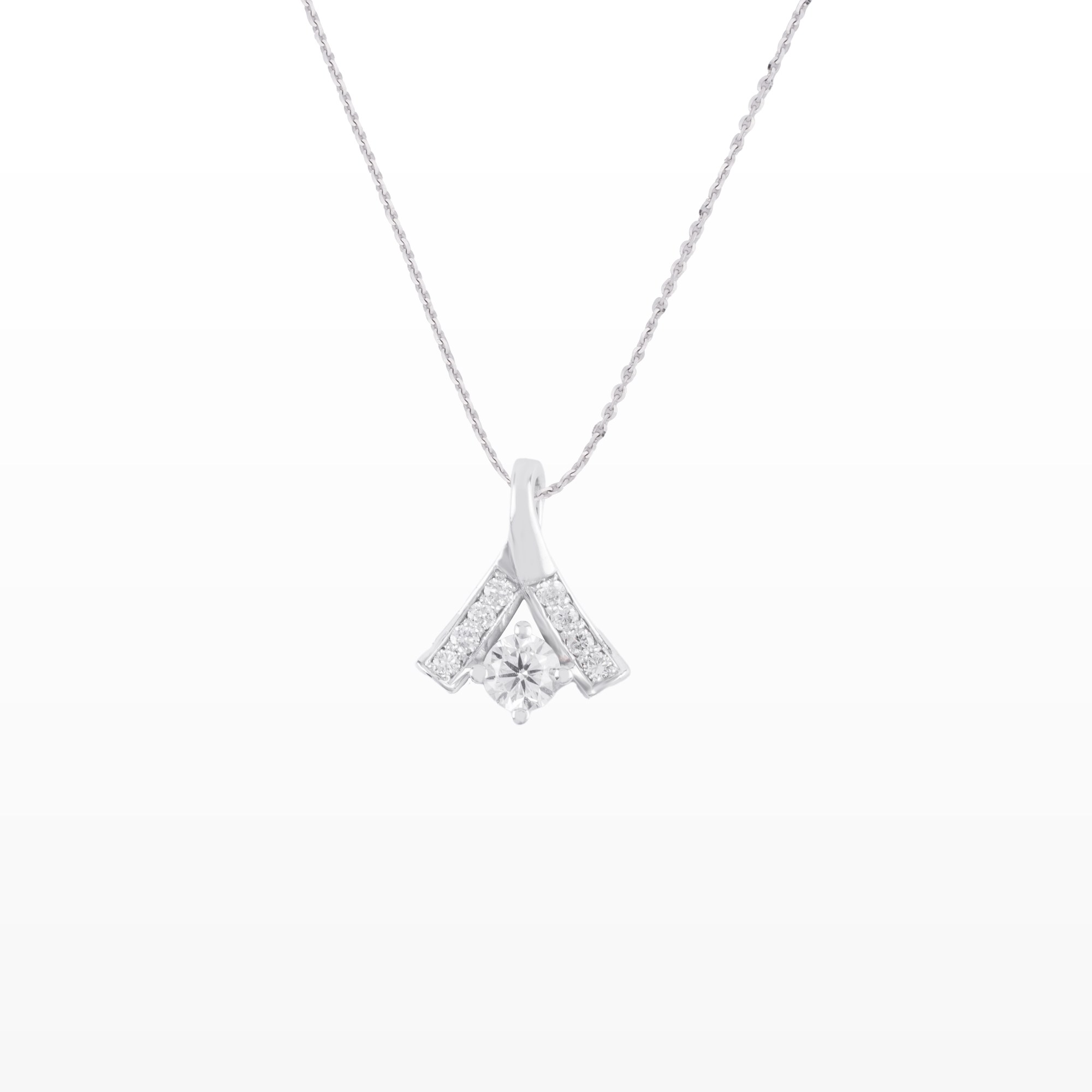 Chiếc mặt dây chuyền sở hữu thiết kế hiện đại đầy tinh xảo, nổi bật với cấu trúc chữ V mở nhẹ, ôm trọn viên kim cương trung tâm như một điểm hội tụ của ánh sáng. Viên kim cương chủ được nâng cao bởi hệ chấu thanh mảnh, giúp tối đa hóa độ bắt sáng, tạo nên hiệu ứng lấp lánh trong trẻo và cuốn hút.