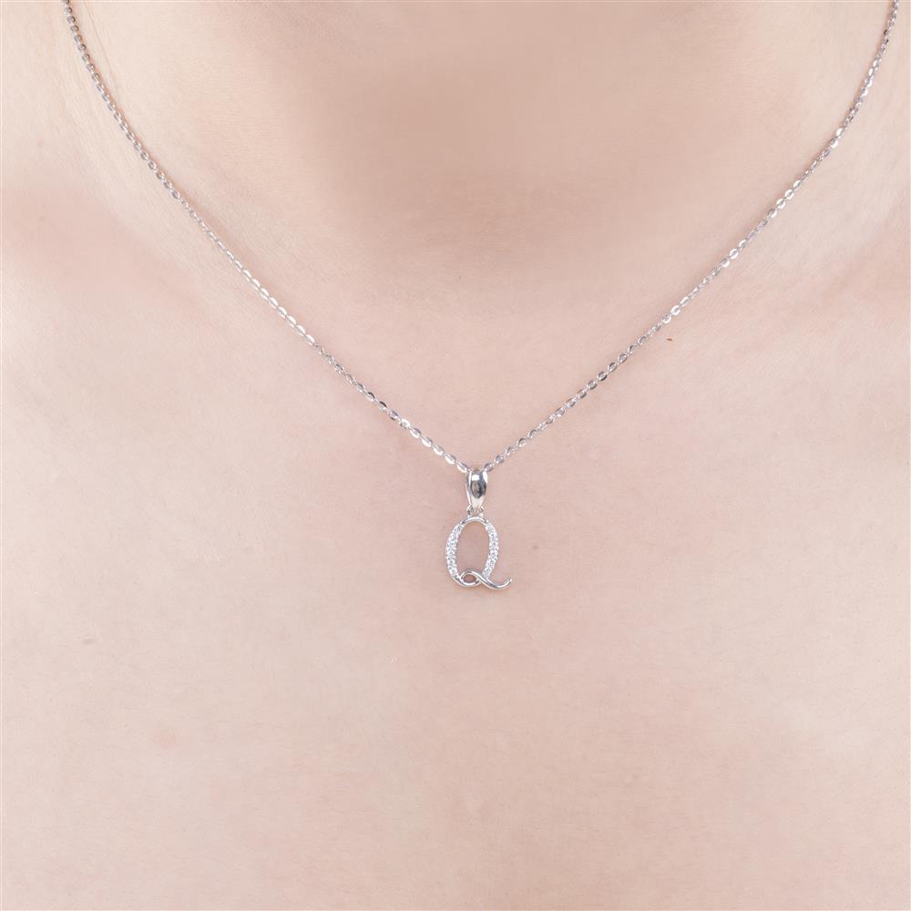 Mặt dây chữ Q được tạo hình mềm mại với đường bo tròn thanh thoát, điểm nhấn là nét uốn tinh xảo phía dưới tạo nên tổng thể vừa lạ mắt, vừa sang trọng. Nửa vòng ký tự được đính đá lấp lánh, ánh sáng phản chiếu nhẹ nhàng như một quầng sáng tinh khiết bao quanh nàng.