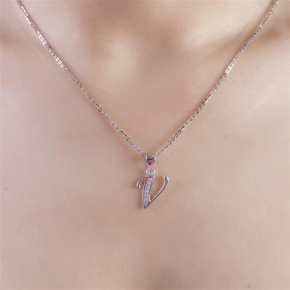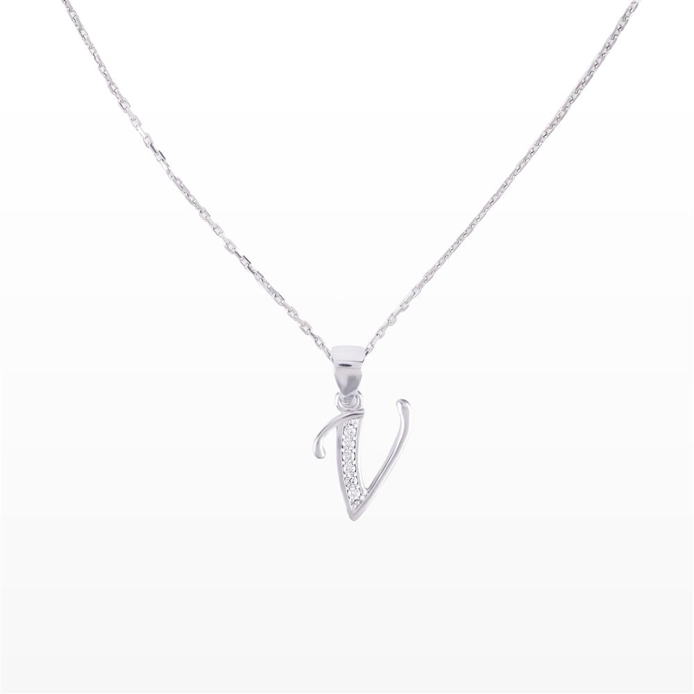 Mặt dây chuyền kim cương được thiết kế theo hình chữ V mềm mại, đường nét uốn cong tinh tế tạo cảm giác thanh thoát và hiện đại. Một nhánh chữ V được đính kim cương lấp lánh, nhánh còn lại trơn mịn, tạo nên sự cân bằng hài hòa giữa điểm nhấn và nét tối giản.