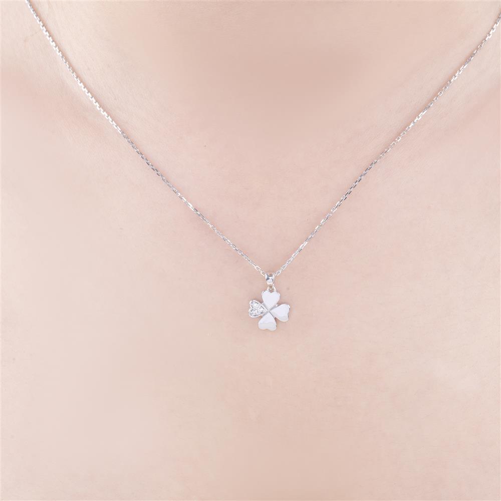 Thiết kế cỏ bốn lá được cách điệu mềm mại với từng cánh hình trái tim, vừa ngọt ngào vừa mang ý nghĩa của tình yêu – hạnh phúc – niềm tin – may mắn. Một cánh được đính đá lấp lánh tạo điểm nhấn tinh tế, giúp mặt dây trở nên rạng rỡ mà không phô trương.