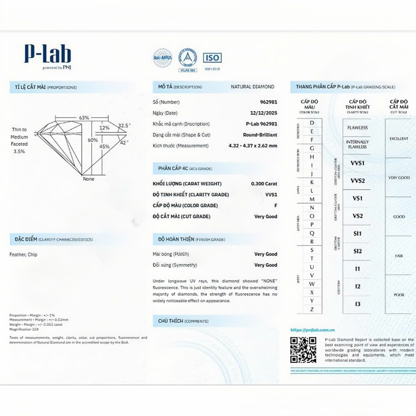 Kim cương viên:4.32 - 4.37 VVS1/F
