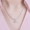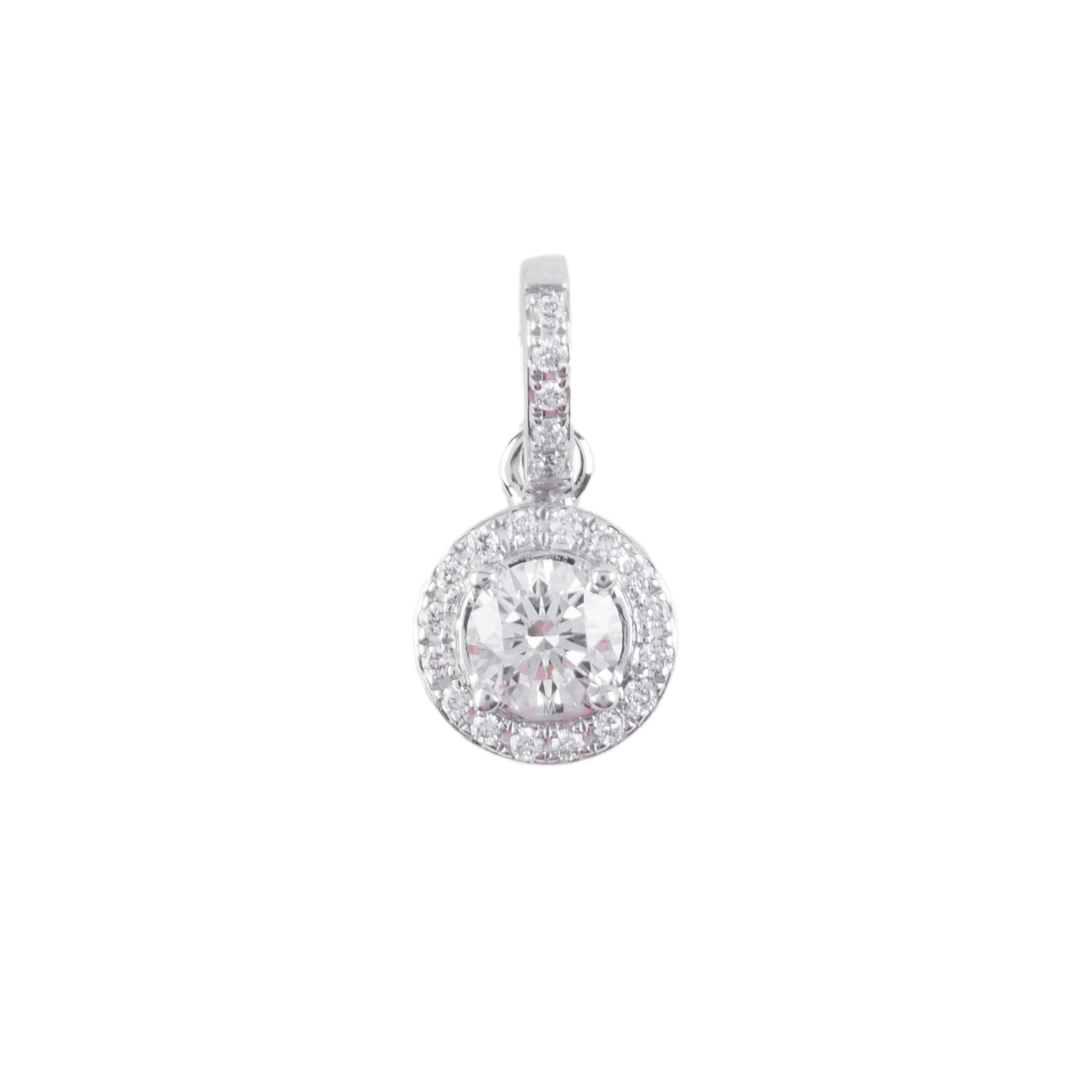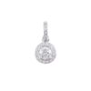 Mặt dây chuyền nổi bật với thiết kế halo cổ điển, nơi viên kim cương chủ tròn được bao quanh bởi vòng kim cương tấm tinh xảo, tạo hiệu ứng ánh sáng lan tỏa rực rỡ như một vầng hào quang. Mỗi chi tiết được hoàn thiện tỉ mỉ, giúp tổng thể trở nên lấp lánh và sang trọng ở mọi góc nhìn.