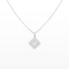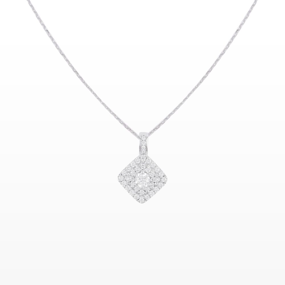 Mặt dây chuyền kim cương vàng trắng thiết kế hình thoi với cụm kim cương tấm được sắp xếp tinh tế quanh viên chủ trung tâm. Bố cục cân đối tạo hiệu ứng lấp lánh nổi bật, mang vẻ đẹp sang trọng và hiện đại, dễ dàng kết hợp cùng nhiều kiểu dây chuyền.
