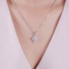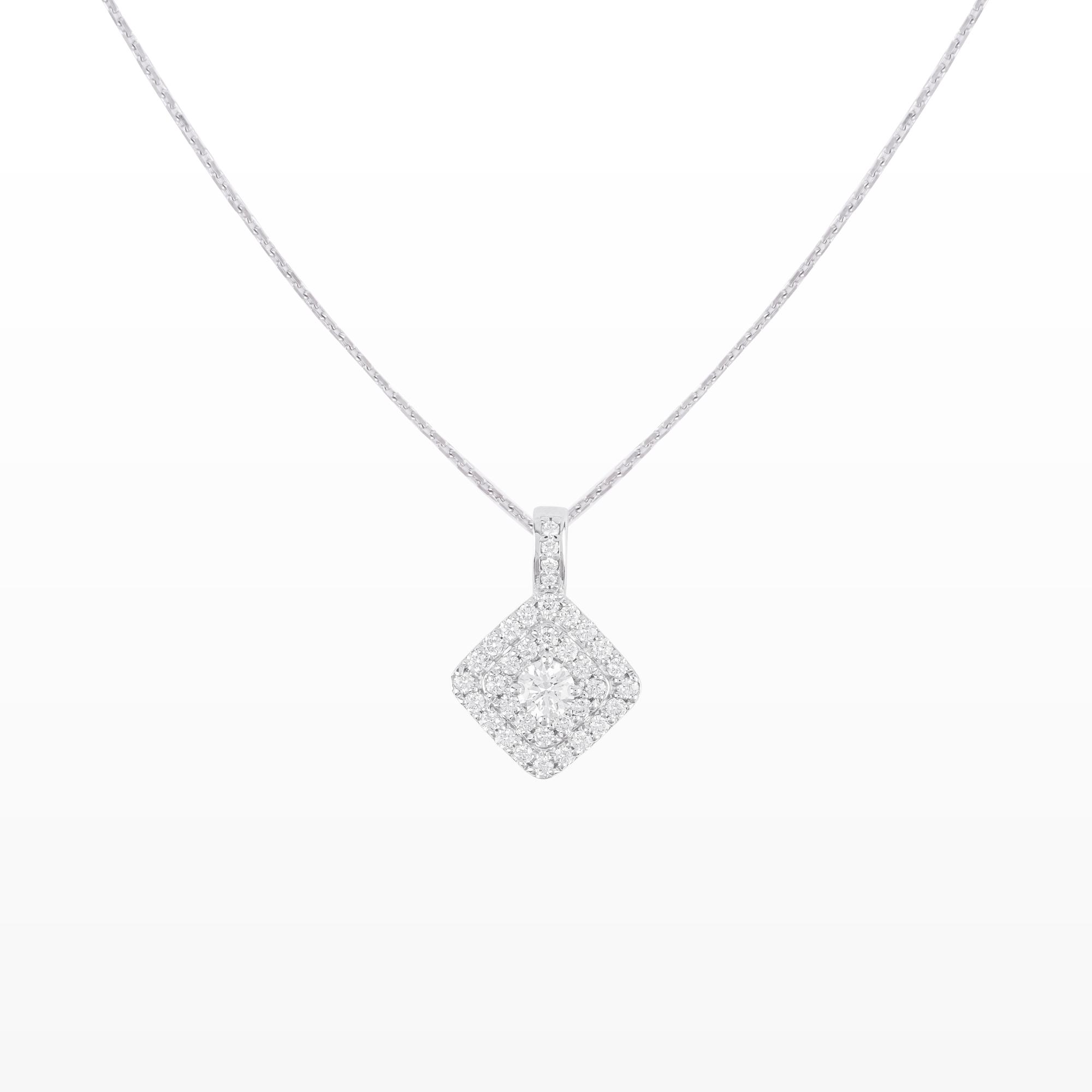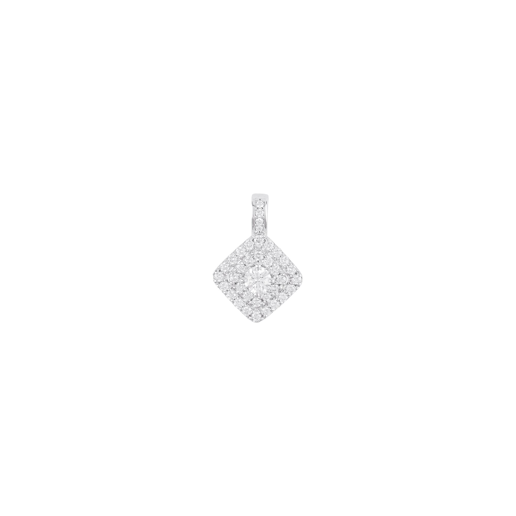 Mặt dây chuyền kim cương vàng trắng thiết kế hình thoi với cụm kim cương tấm được sắp xếp tinh tế quanh viên chủ trung tâm. Bố cục cân đối tạo hiệu ứng lấp lánh nổi bật, mang vẻ đẹp sang trọng và hiện đại, dễ dàng kết hợp cùng nhiều kiểu dây chuyền.