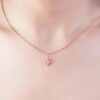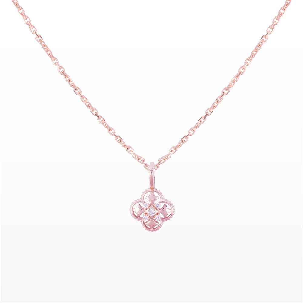 Mặt dây chuyền được thiết kế theo hình hoa 4 cánh đối xứng, các cánh hoa bo cong mềm mại, tạo cảm giác hài hòa và thanh thoát. Trung tâm là cụm kim cương nhỏ lấp lánh, được sắp xếp tinh tế, mang lại điểm nhấn rực rỡ nhưng vẫn nhẹ nhàng.